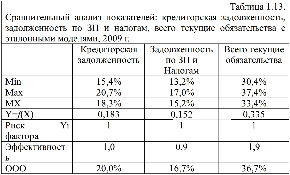 Сравнительный анализ показателей: кредиторская задолженность, задолженность по ЗП и налогам, всего текущие обязательства с эталонными моделями, 2009 г.