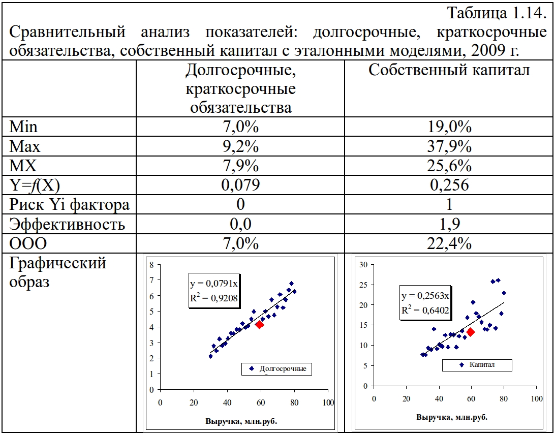 Проведем анализ фактора долгосрочные, краткосрочные обязательства (X14→Y) и его зависимость от выручки (X) и показателя собственный капитал (X15→Y) от выручки (X). Для наглядности эконометрические зависимости от выручки представлены на графиках и сведены в табл. 1.14.