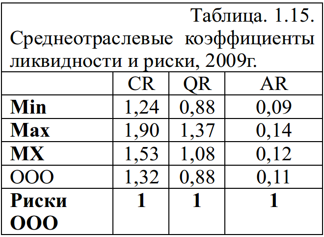 Среднеотраслевые коэффициенты ликвидности и риски, 2009г.