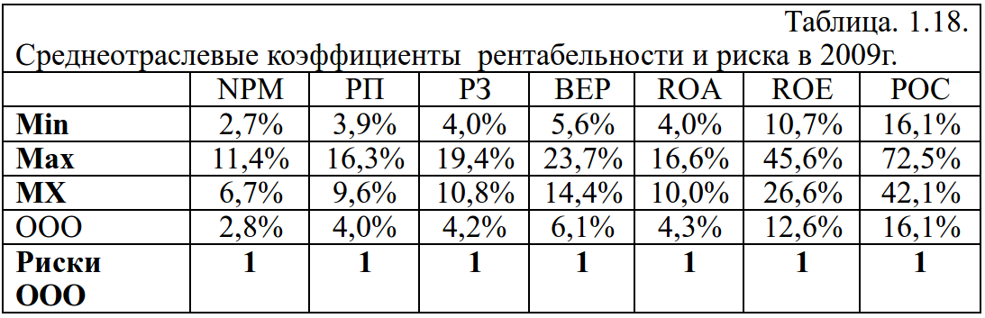 Среднеотраслевые коэффициенты рентабельности и риска в 2009г.