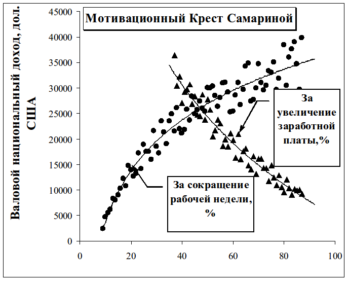 К ним относятся: степень значимости свободного времени, степень значимости оплаты труда, минимальная заработная плата, степень значимости труда, степень значимости образования, доля заработной платы в ВВП, уровень индексации заработной платы, уровень дифференциации оплаты труда, уровень инвестиций в персонал, уверенность в завтрашнем дне, дифференциация доходов населения. На базе обнаруженных факторов построен n-мерный производственно-мотивационный крест Самариной, который должен проявляться на уровне фирмы, отрасли, региона, страны и межгосударственном сравнении в сопоставимых ценах. Невозможность его построения на уровне страны, региона, отрасли, фирмы свидетельствует о проблемах в социально-экономической политике и высоких ноосферных рисках.