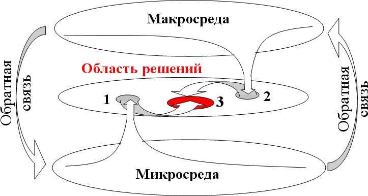 Авторы считают, что цель управления и моделирования заключается в том, чтобы с помощью обратных связей, показанных на рис. 1.15, осуществить стягивание, корректировку начальных, граничных условий, что, в свою очередь, вызывает эконометрическое изменение модели в целом. Зоны 1 и 2 будут стягиваться в зону 3, в которой учитываются требования микросреды фирмы по оптимальному управлению персоналом и обеспечению его соответствующими технологиями и капиталом с учетом запросов макро, мезо среды фирмы. В тоже время, учитывая, что модели макро, мезо среды отражают средние тенденции в отрасли, а фирма может по своим показателям превосходить эти данные, то в этом случае модели макро, мезо среды корректируется в пользу моделей микросреды. Т.к. на самом деле оптимальная зона находится не в точке 3 или 2, а в точке 1, при условии, что фирма по всем показателям превосходит среднеотраслевые данные. Если же фирма явно отстает от средних показателей своих конкурентов, то можно с уверенностью сказать, что зона оптимума находится не в точке 1 и 3, а в точке 2, и всем подразделениям фирмы следует пересмотреть свои плановые показатели и оценку своей деятельности. Если же фирма по ряду показателей лучше среднеотраслевых, а по ряду хуже, то в этом случае производится подгонка и макро, и микро моделей. Тогда зона 1 и зона 2 должны быть стянуты в зону 3. Данный процесс итерационен и каждое из изменений по любому количеству факторов (в наших исследованиях около 5000 показателей по каждой отрасли) может осуществляться автоматически с помощью модифицированного метода Монте-Карло.