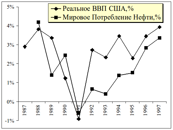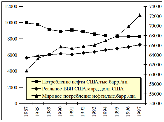 Так, в частности, по данным Минэнерго США за период 1987-1997 г.г. потребление нефти упало с 9945 до 8255 тыс. баррелей в день. При этом структурных, технологических изменений за рассматриваемый период в производстве электроэнергии не произошло, как отмечает министерство энергетики США. В тоже время по данным бюро экономического анализа Министерства торговли (BEA DOC) США реальное ВВП выросло с 6475 до 8704 млрд. долл.США, т.е. на 34%. В этот же период мировое потребление нефти имело устойчивую тенденцию роста с 60725 до 72215 тыс. баррелей в день, т.е. на 18.9%.
