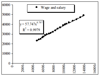 Очевидно, что данный вывоз энергоемких производств, а также производств с высоким уровнем мультипликаторов должен быть скомпенсирован ростом ВВП в других отраслях. Это легко обнаруживается, если проанализировать динамику финансовой системы, предприятий недвижимости (F.I.R.E. - Finance, insurance, real estate, rental, and leasing), а также предприятий, связанных с информационными технологиями. Именно здесь и наблюдался повышенный рост оплаты труда, который должен был как-то скомпенсировать потери персонала вывезенных предприятий. Это подтверждается, если исследовать зависимость показателя оплаты труда (Wage and salary accruals per full-time equivalent employee) по отношению к ВВП за период 1987-2007 г.г. На самом деле, в целом, скорость нарастания функции или эластичность составляет величину в размере 0.707, что наглядно видно на графике (см. рис. 3.20.).