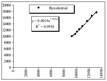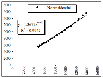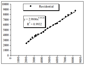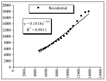 Рис. 3.23. Динамика величин основных фондов в жилищном (Residential) секторе от ВВП за период 1987-2007 г.г. По оси Y – номинальная величина основных фондов в жилищном секторе в млрд. долл.США. По оси Х – номинальное ВВП в млрд. долл.США