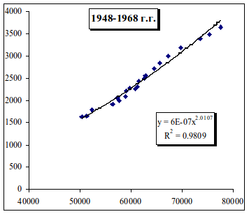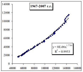Рис. 3.28. Динамика реального ВВП, в млрд. долл.США за 1947-2007 г.г. По оси Х – численность персонала, тыс.чел.