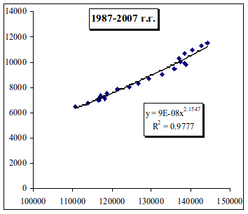 Это подтверждают не только функциональные зависимости до 1997 г., эластичность составляла 0.8828, а на следующем этапе за период 1998-2006 г.г. скорость нарастания функции практически удвоилась, эластичность составила 1.6956 (см. рис. 3.24., 3.25. и предыдущий рис. 3.23.).