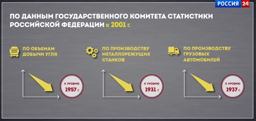 Подробный сравнительный анализ динамики развития экономики СССР (Калабеков И.Г. «СССР и страны мира в цифрах») и Ельцинско-Гайдаровско-Чубайсовских либерально-фашистских «реформ» (Калабеков И.Г. «Российские реформы в цифрах и фактах») дан в замечательных книгах, исследованиях И.Г.Каламбекова. По данным И.Г.Каламбекова: