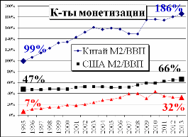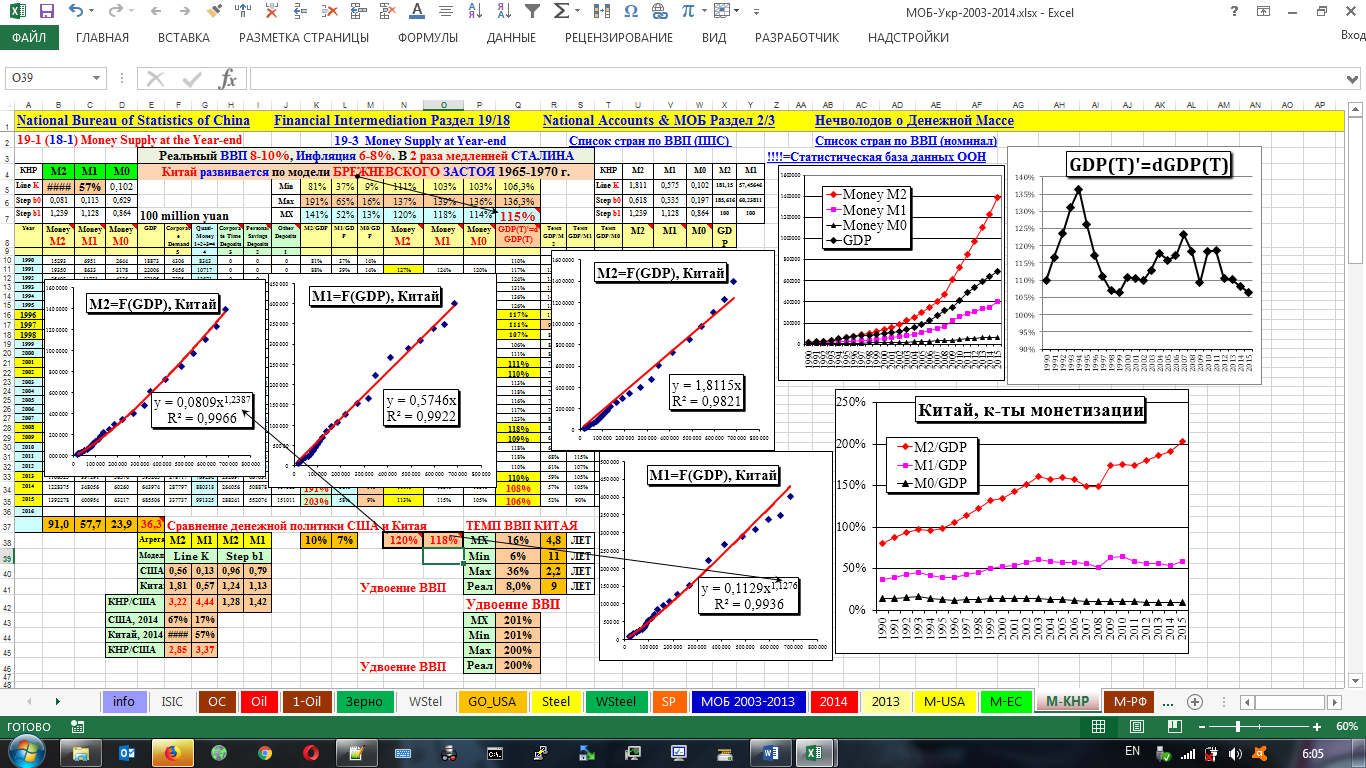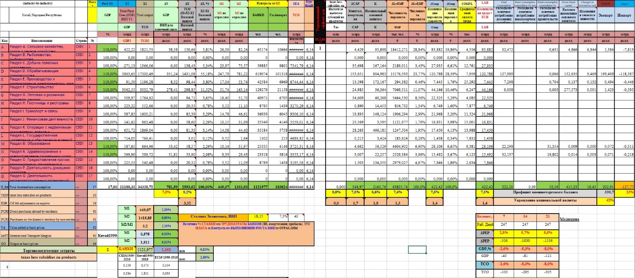 Проведём исследование по всем секторам экономики, используя межотраслевой баланс 2014 года государства "Китай, Народная Республика" (Таблица 2.43). В рамках межотраслевого моделирования, планируется развитие экономики по ВВП в размере 781,59 млрд. долл. США. Изменение ВВП составит величину 7,52 %. Мультипликативное воздействие на экономику равно 3,318. Повышение интегрального объёма продаж по всей экономике указанной страны равно 2593,62 млрд. долл. США. С применением теории систем, выполнен анализ монетарных политик и финансовых систем США, ЕС, КНР. Произведён расчёт и определены величины денежных агрегатов: М1 (М0 + чеки, вклады до востребования, в том числе банковские дебетовые карты), М2 (М1 + срочные вклады). В процессе межотраслевого моделирования и планируемого изменения в экономике государства "Китай, Народная Республика" по ВВП рассчитан прирост денежного агрегата М1 в размере 449,073 млрд. долл. США, а денежного агрегата М2 в размере 1415,848 млрд. долл. США. C учетом трудозатрат банков, расчётно-кассовых центров ЦБ, страховых компаний, процентная ставки составит величину от 0,32 % до 2,38 %. Количество контролёров по финансовым потокам агрегатов М1 и М2 составит 1121,977 тыс. чел. Из них: работники ЦБ, банков, расчётно-кассовых центров, страховых компаний - 1121977 чел.; служащие государственных органов финансового контроля - 183624 чел.