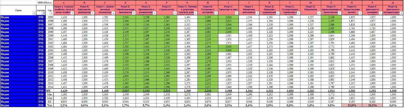 Выполненный анализ экономики государства "Индия" за период 1995-2014 гг., на основе межотраслевого моделирования, указанный в таблице 2.47, свидетельствует о том, что основными социально-экономическими тактическими приоритетами экономики государства являются: "Раздел А. Сельское хозяйство, охота и лесное хозяйство", среднее мультипликативное воздействие равно 1,429. Значение минимального мультипликативного воздействия равно 1,38. Максимальная величина мультипликативного воздействия равна 1,484. Значение среднеквадратичного отклонения составляет 0,033. Размер вариации равен 2,3%. "Раздел Е. Производство и распределение электроэнергии, газа и воды", размер среднего мультипликатора составляет 2,215. Величина минимального мультипликативного воздействия составляет 2,04. Величина максимального мультипликатора составляет 2,454. Размер среднеквадратичного отклонения равен значению 0,125. Значение вариации составляет 5,7%. "Раздел F. Строительство", среднее мультипликативное воздействие равно 2,321. Минимальная величина мультипликативного воздействия равна 2,218. Размер максимального мультипликатора составляет 2,439. Размер среднеквадратичного отклонения равен 0,055. Размер вариации составляет 2,4%. "Раздел D. Обрабатывающие производства", среднее мультипликативное воздействие равно 2,537. Минимальный мультипликативный эффект составляет 2,459. Максимальное мультипликативное воздействие составляет 2,613. Размер среднеквадратичного отклонения равен значению 0,044. Размер вариации составляет 1,7%. Для гармоничного развития государства необходимо развивать следующие стратегические социально-экономические направления экономики: "Раздел M. Образование", значение среднего мультипликативного воздействия равно 1,202. Минимальный мультипликативный эффект равен 1,18. Максимальный мультипликатор равен 1,239. Размер среднеквадратичного отклонения составляет 0,019. Размер вариации составляет 1,6%. "Раздел N. Здравоохранение и предоставление социальных услуг", средний мультипликативный эффект равен 1,911. Минимальный мультипликативный эффект равен 1,772. Максимальный мультипликативный эффект составляет 2,301. Размер среднеквадратичного отклонения равен 0,187. Размер вариации равен значению 9,8%. Информационно-вспомогательными секторами экономики данной страны являются: "Раздел G. Оптовая и розничная торговля; ремонт автотранспортных средств, мотоциклов, бытовых изделий и предметов личного пользования", величина среднего мультипликативного воздействия составляет 1,309. Минимальный мультипликативный эффект составляет 1,27. Размер максимального мультипликатора составляет 1,404. Значение среднеквадратичного отклонения равно 0,032. Значение вариации составляет 2,4%. "Раздел J. Финансовая деятельность", средняя величина мультипликативного эффекта равна 1,364. Величина минимального мультипликатора составляет 1,296. Размер максимального мультипликативного воздействия составляет 1,437. Размер среднеквадратичного отклонения равен 0,046. Размер вариации равен значению 3,4%.