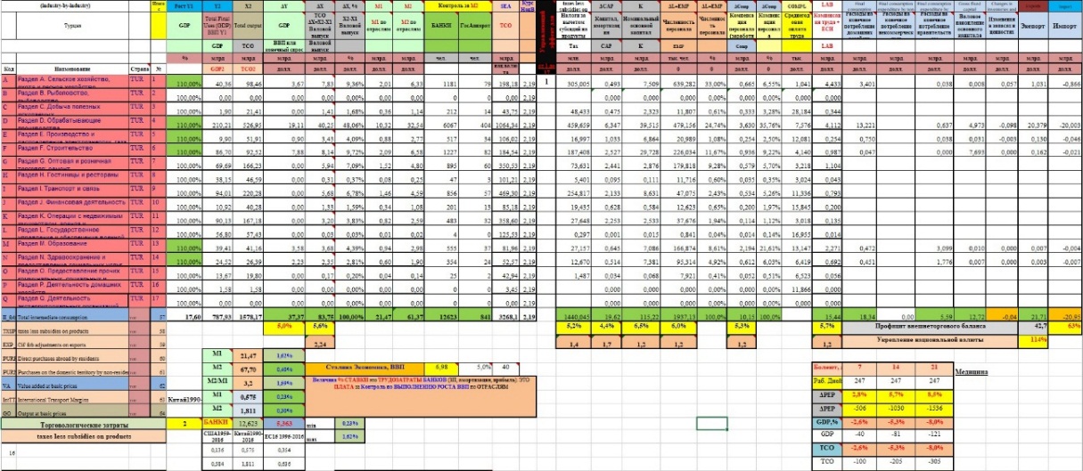 Проведём исследование по всем отраслям экономики на основе межотраслевого баланса 2014 года государства "Турция" (Таблица 2.67). В рамках межотраслевого моделирования, планируется развитие экономики по ВВП в размере 37,37 млрд. долл. США. Изменение ВВП составит величину 4,98 %. Значение мультипликатора по экономике равно 2,241. Повышение интегрального объёма продаж по всей экономике указанной страны равно 83,75 млрд. долл. США. С применением теории систем, выполнен анализ монетарных политик и финансовых систем США, ЕС, КНР. Произведён расчёт и определены величины денежных агрегатов: М1 (М0 + чеки, вклады до востребования, в том числе банковские дебетовые карты), М2 (М1 + срочные вклады). В результате межотраслевого моделирования с учетом планируемого изменения в экономике государства "Турция" по ВВП рассчитано расширение денежного агрегата М1 в размере 21,472 млрд. долл. США, а денежного агрегата М2 в размере 67,699 млрд. долл. США. C учетом трудозатрат банков, расчётно-кассовых центров ЦБ, страховых компаний, процентная ставки составит величину от 0,23 % до 1,62 %. Количество контролёров по финансовым потокам агрегатов М1 и М2 составит 12,623 тыс. чел. Из них: работники ЦБ, банков, расчётно-кассовых центров, страховых компаний - 12623 чел.; служащие государственных органов финансового контроля - 841 чел.