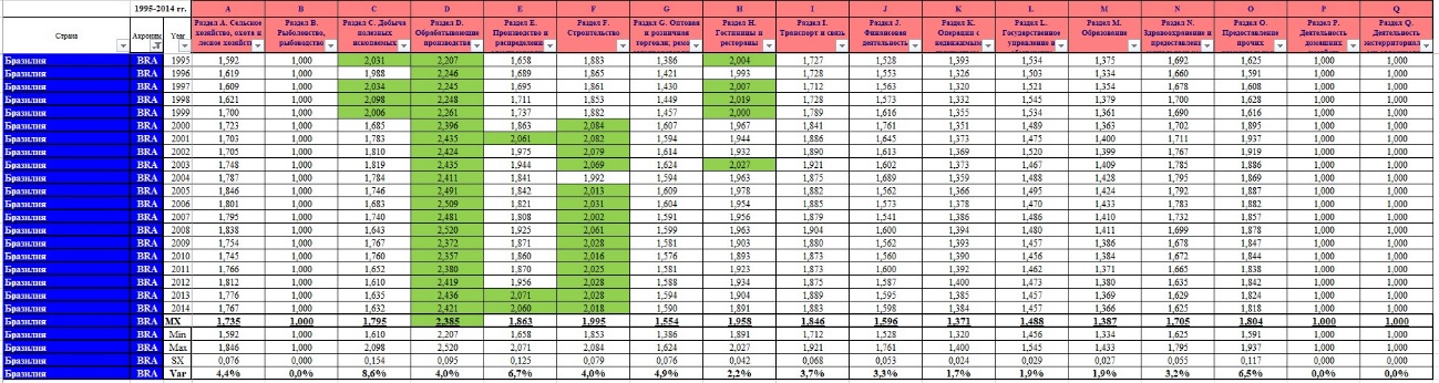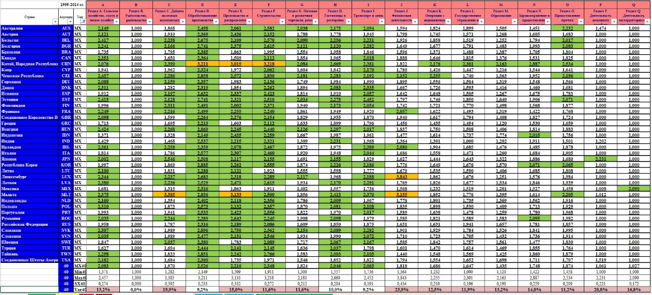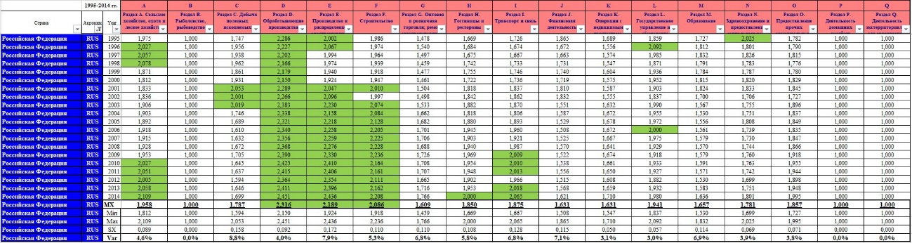 Интегральная таблица 2.62 межотраслевого моделирования государства "Российская Федерация" за период 1995-2014 гг. показывает, что ведущими социально-экономическими тактическими инвестиционными приоритетами государства являются следующие секторы экономики: "Раздел А. Сельское хозяйство, охота и лесное хозяйство", величина среднего мультипликатора составляет 1,958. Значение минимального мультипликативного воздействия равно 1,812. Величина максимального мультипликативного воздействия составляет 2,109. Значение среднеквадратичного отклонения равно 0,089. Размер вариации составляет 4,6%. "Раздел Е. Производство и распределение электроэнергии, газа и воды", среднее мультипликативное воздействие равно 2,189. Значение минимального мультипликативного эффекта равно 1,924. Размер максимального мультипликативного эффекта равен значению 2,436. Размер среднеквадратичного отклонения равен 0,172. Размер вариации равен 7,9%. "Раздел F. Строительство", среднее мультипликативное воздействие составляет 2,086. Значение минимального мультипликатора равно 1,918. Величина максимального мультипликатора составляет 2,236. Размер среднеквадратичного отклонения равен значению 0,11. Вариация составляет 5,3%. "Раздел D. Обрабатывающие производства", размер среднего мультипликатора составляет 2,316. Размер минимального мультипликативного эффекта равен значению 2,15. Размер максимального мультипликатора составляет 2,451. Размер среднеквадратичного отклонения равен значению 0,092. Размер вариации составляет 4%. Ведущими стратегическими социально-экономическими инвестиционными приоритетами страны являются следующие направления экономики: "Раздел M. Образование", средний мультипликативный эффект равен 1,657. Минимальный мультипликативный эффект равен 1,53. Максимальная величина мультипликативного воздействия равна 1,832. Значение среднеквадратичного отклонения составляет 0,114. Размер вариации составляет 6,9%. "Раздел N. Здравоохранение и предоставление социальных услуг", среднее мультипликативное воздействие равно 1,781. Минимальное мультипликативное воздействие равно 1,699. Максимальное мультипликативное воздействие равно 2,025. Среднеквадратичное отклонение составляет 0,069. Значение вариации составляет 3,9%. Отметим, что к развивающимся за счёт основных приоритетов указанной страны, информационно-вспомогательными секторами экономики являются: "Раздел G. Оптовая и розничная торговля; ремонт автотранспортных средств, мотоциклов, бытовых изделий и предметов личного пользования", среднее мультипликативное воздействие равно 1,609. Минимальное мультипликативное воздействие равно 1,459. Максимальный мультипликатор равен 1,766. Размер среднеквадратичного отклонения составляет 0,11. Значение вариации составляет 6,8%. "Раздел J. Финансовая деятельность", средняя величина мультипликативного воздействия равна 1,631. Значение минимального мультипликативного воздействия равно 1,508. Максимальный мультипликативный эффект равен 1,865. Среднеквадратичное отклонение составляет 0,115. Значение вариации равно 7,1%.