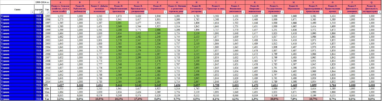 Таблица 2.65 - Анализ размеров мультипликативных эффектов основных тактических и стратегических секторов экономики государства "Турция" за период 1995-2014 гг.