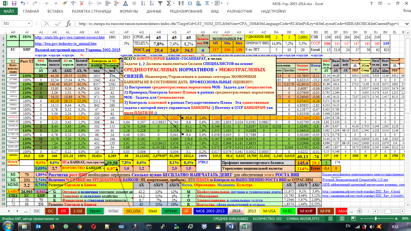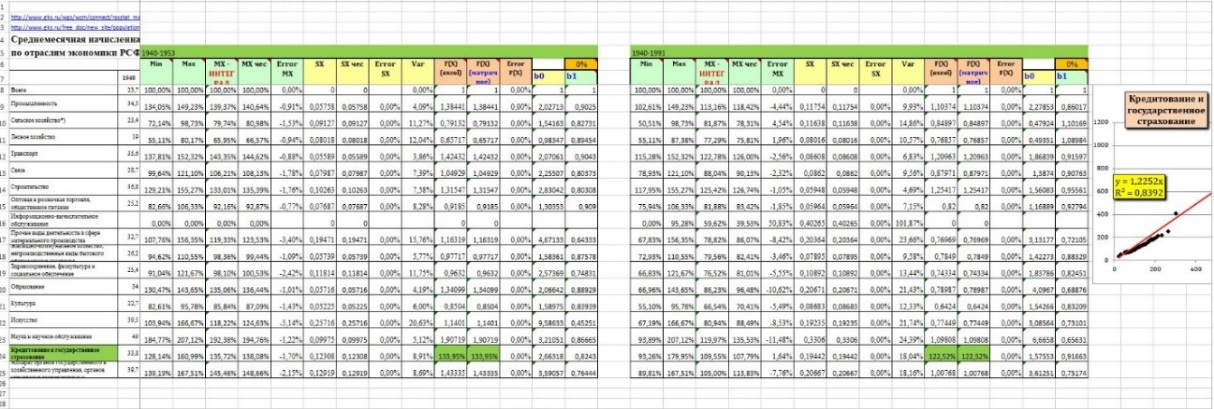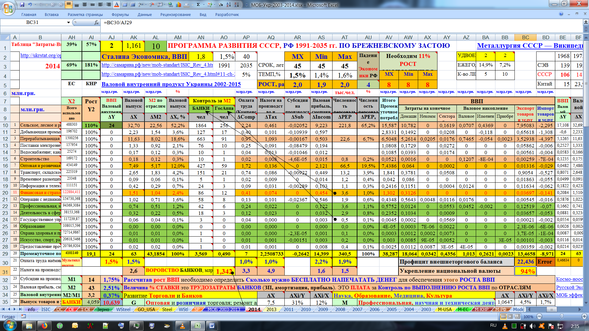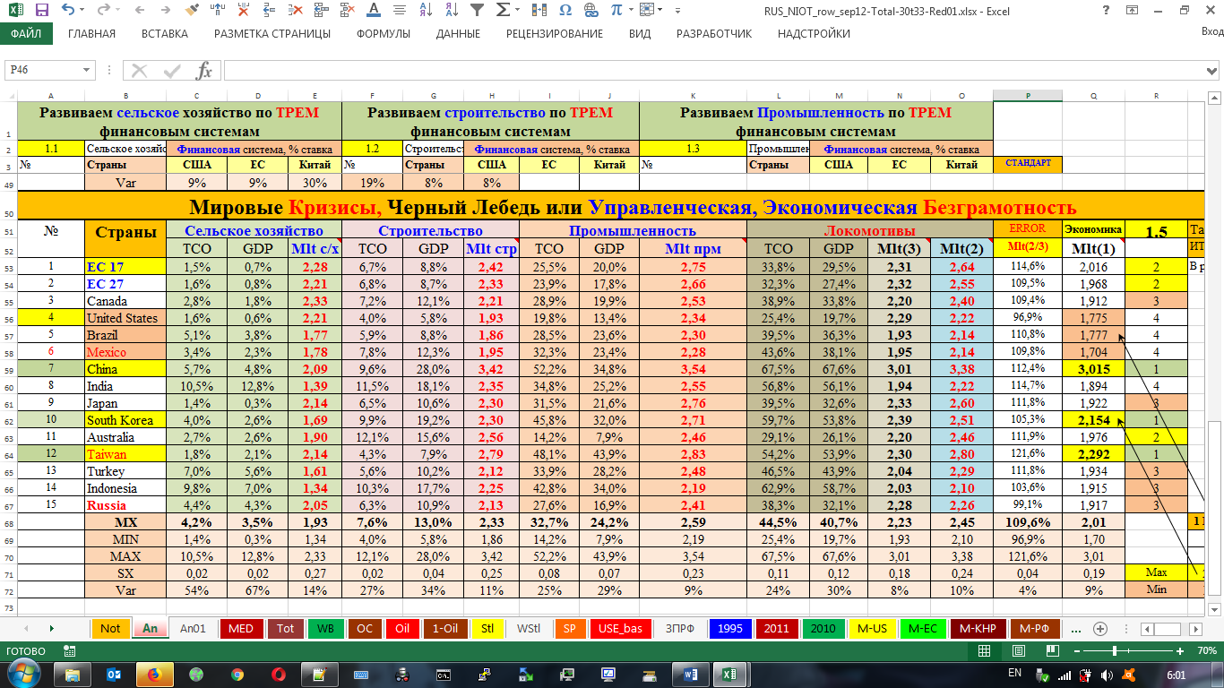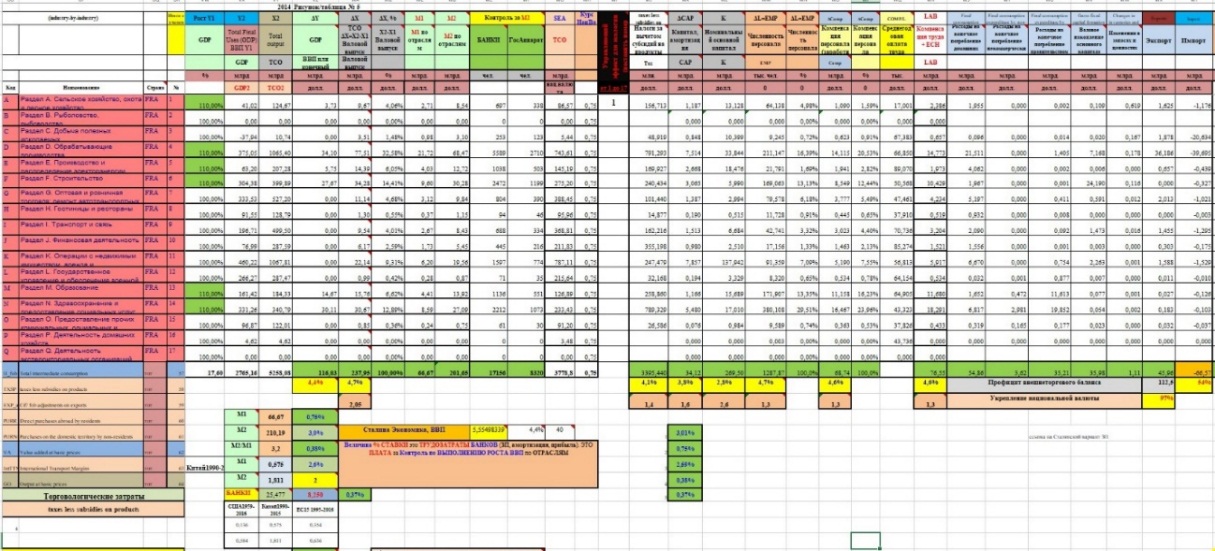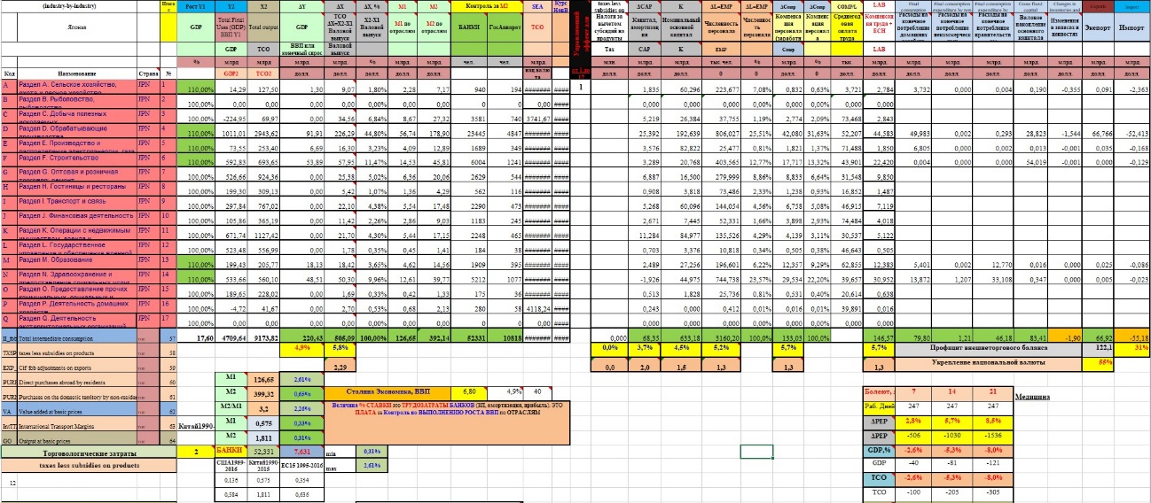 Выполним исследование по всем секторам экономики, применяя межотраслевой баланс 2014 года государства "Российская Федерация" (Таблица 2.64). В рамках межотраслевого моделирования, планируется развитие экономики по ВВП в размере 71,64 млрд. долл. США. Изменение ВВП составит величину 4,15 %. Величина мультипликативного воздействия на все секторы экономики составляет 2,165. Увеличение общего объёма продаж по всем секторам экономики указанного государства составит 155,12 млрд. долл. США. В рамках теории систем, выполнен анализ финансовых систем и монетарных политик США, ЕС, КНР. Проведены расчёты и определены величины денежных агрегатов: М1 (М0 + чеки, вклады до востребования, в том числе банковские дебетовые карты), М2 (М1 + срочные вклады). В процессе межотраслевого моделирования с учётом планируемого изменения в экономике государства "Российская Федерация" по ВВП рассчитан прирост денежного агрегата М1 в размере 41,162 млрд. долл. США, а денежного агрегата М2 в размере 129,776 млрд. долл. США. C учетом трудозатрат банков, расчётно-кассовых центров ЦБ, страховых компаний, процентная ставки составит величину от 0,12 % до 2,45 %. Количество контролёров по финансовым потокам агрегатов М1 и М2 составит 11,382 тыс. чел. Из них: работники ЦБ, банков, расчётно-кассовых центров, страховых компаний - 11382 чел.; служащие государственных органов финансового контроля - 45138 чел.