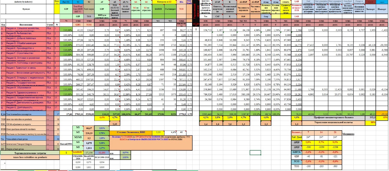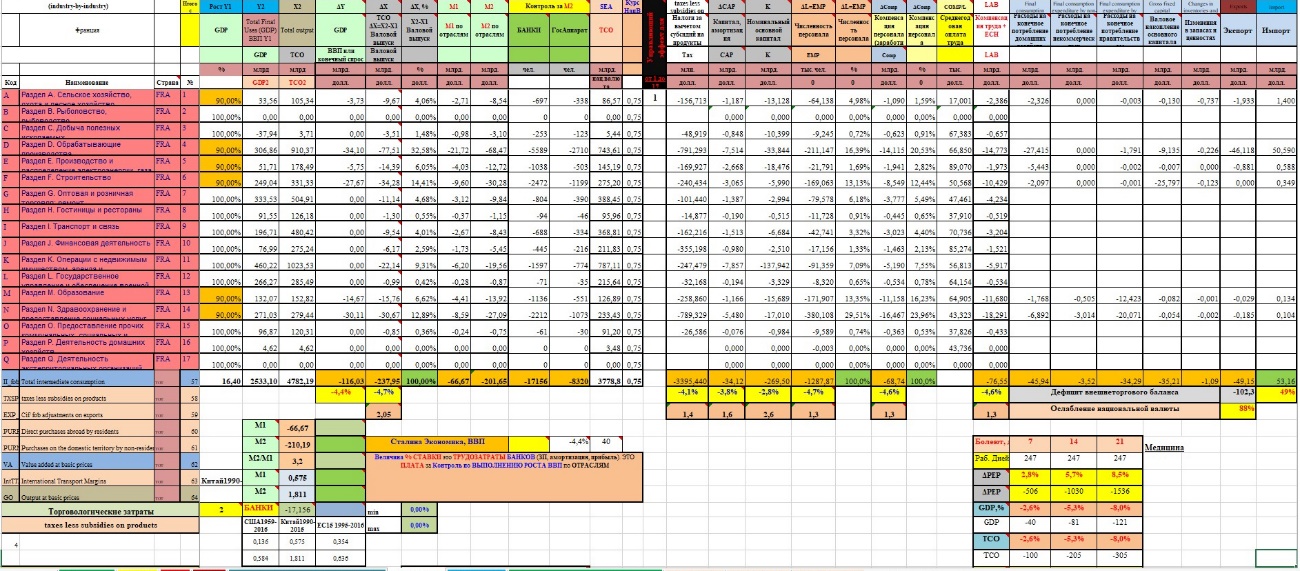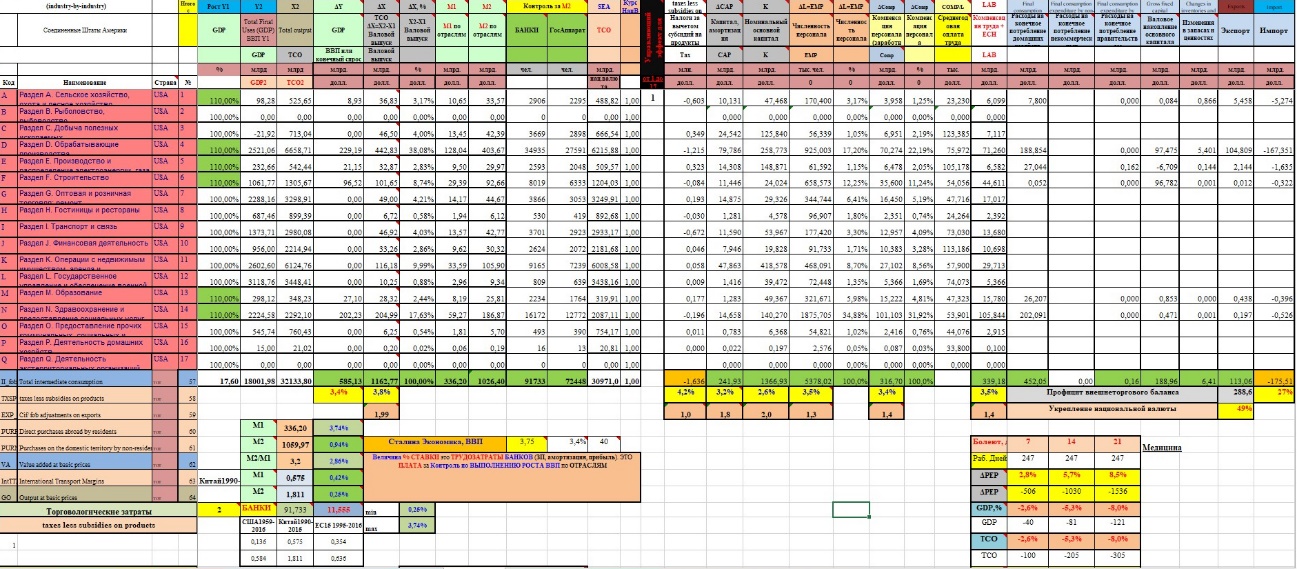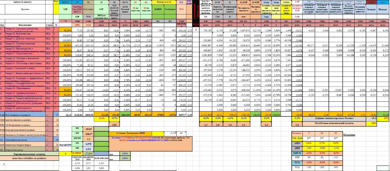 Проведём разбор итоговых значений показателей по всем отраслям экономики выбранной страны: Итоговый показатель "ВВП или конечный спрос" равен -220,434 млрд. долл. США, изменения составляют -4,91 %. Суммарный показатель "Валовой выпуск" составляет значение -505,088 млрд. долл. США, изменения составляют -5,83 %, мультипликативный эффект равен значению 2,291. Обобщённый показатель "Налоги за вычетом субсидий на продукты" равен величине 0 млн. долл. США, изменения составляют 0 %, величина мультипликативного воздействия равна 0. Обобщённый показатель "Капитал, амортизация" составляет -68,352 млрд. долл. США, изменения составляют -3,69 %, размер мультипликатора равен 1,972. Совокупный показатель "Номинальный основной капитал" составляет величину -633,179 млрд. долл. США, изменения составляют -4,53 %, мультипликативное воздействие составляет величину 1,477. Интегральный показатель "Численность персонала" составляет -3160,201 тыс. чел., изменения составляют -5,16 %, мультипликативный эффект составляет 1,317. Суммарный показатель "Компенсация персонала (заработная плата)" составляет значение -133,034 млрд. долл. США, изменения составляют -5,7 %, мультипликативный эффект равен значению 1,275. Обобщённый показатель "Компенсация труда + ЕСН " равен величине -146,57 млрд. долл. США, изменения составляют -5,66 %, мультипликативный эффект равен значению 1,275. Обобщённый показатель "Экспорт" равен величине -66,922 млрд. долл. США. Совокупный показатель "Импорт" составляет величину 55,181 млрд. долл. США.