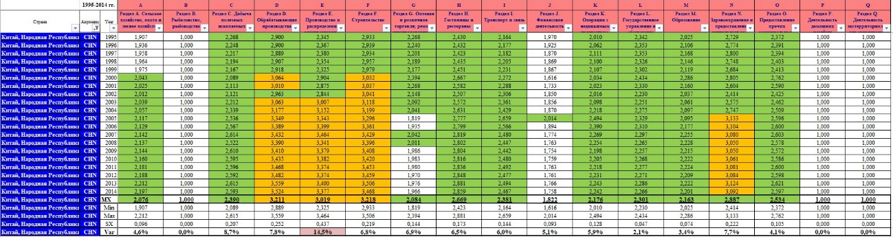 В соответствии с межотраслевым исследованием экономики государства "Китай, Народная Республика" за период 1995-2014 гг., отражённого в таблице 2.41, следует, что основными социально-экономическими тактическими инвестиционными приоритетами государства являются: "Раздел А. Сельское хозяйство, охота и лесное хозяйство", величина среднего мультипликатора составляет 2,076. Минимальное мультипликативное воздействие равно 1,907. Размер максимального мультипликативного воздействия составляет 2,212. Размер среднеквадратичного отклонения равен 0,096. Размер вариации равен 4,6%. "Раздел Е. Производство и распределение электроэнергии, газа и воды", значение среднего мультипликативного воздействия равно 3,019. Величина минимального мультипликативного воздействия составляет 2,325. Значение максимального мультипликативного воздействия равно 3,464. Размер среднеквадратичного отклонения равен 0,437. Размер вариации равен 14,5%. "Раздел F. Строительство", среднее мультипликативное воздействие составляет 3,218. Минимальный мультипликативный эффект равен 2,933. Максимальный мультипликативный эффект составляет 3,506. Размер среднеквадратичного отклонения равен значению 0,219. Вариация составляет 6,8%. "Раздел D. Обрабатывающие производства", среднее мультипликативное воздействие составляет 3,211. Минимальный мультипликативный эффект составляет 2,889. Размер максимального мультипликативного эффекта равен значению 3,559. Размер среднеквадратичного отклонения равен значению 0,252. Размер вариации составляет 7,8%. С целью формирования эффективного кадрового потенциала, необходимо развивать следующие стратегические социально-экономические направления экономики: "Раздел M. Образование", средний мультипликативный эффект составляет 2,163. Минимальное мультипликативное воздействие равно 2,025. Максимальный мультипликативный эффект равен 2,286. Размер среднеквадратичного отклонения составляет 0,074. Размер вариации равен 3,4%. "Раздел N. Здравоохранение и предоставление социальных услуг", средний мультипликативный эффект равен 2,887. Минимальная величина мультипликативного воздействия равна 2,414. Максимальный мультипликативный эффект составляет 3,133. Среднеквадратичное отклонение составляет 0,222. Размер вариации составляет 7,7%. Информационно-вспомогательными секторами экономики данной страны являются: "Раздел G. Оптовая и розничная торговля; ремонт автотранспортных средств, мотоциклов, бытовых изделий и предметов личного пользования", значение среднего мультипликативного эффекта равно 2,084. Минимальное мультипликативное воздействие равно 1,819. Максимальное мультипликативное воздействие равно 2,394. Размер среднеквадратичного отклонения равен значению 0,144. Размер вариации равен 6,9%. "Раздел J. Финансовая деятельность", размер среднего мультипликатора составляет 1,822. Минимальный мультипликативный эффект равен 1,616. Величина максимального мультипликативного воздействия составляет 2,014. Размер среднеквадратичного отклонения равен 0,093. Размер вариации равен 5,1%.