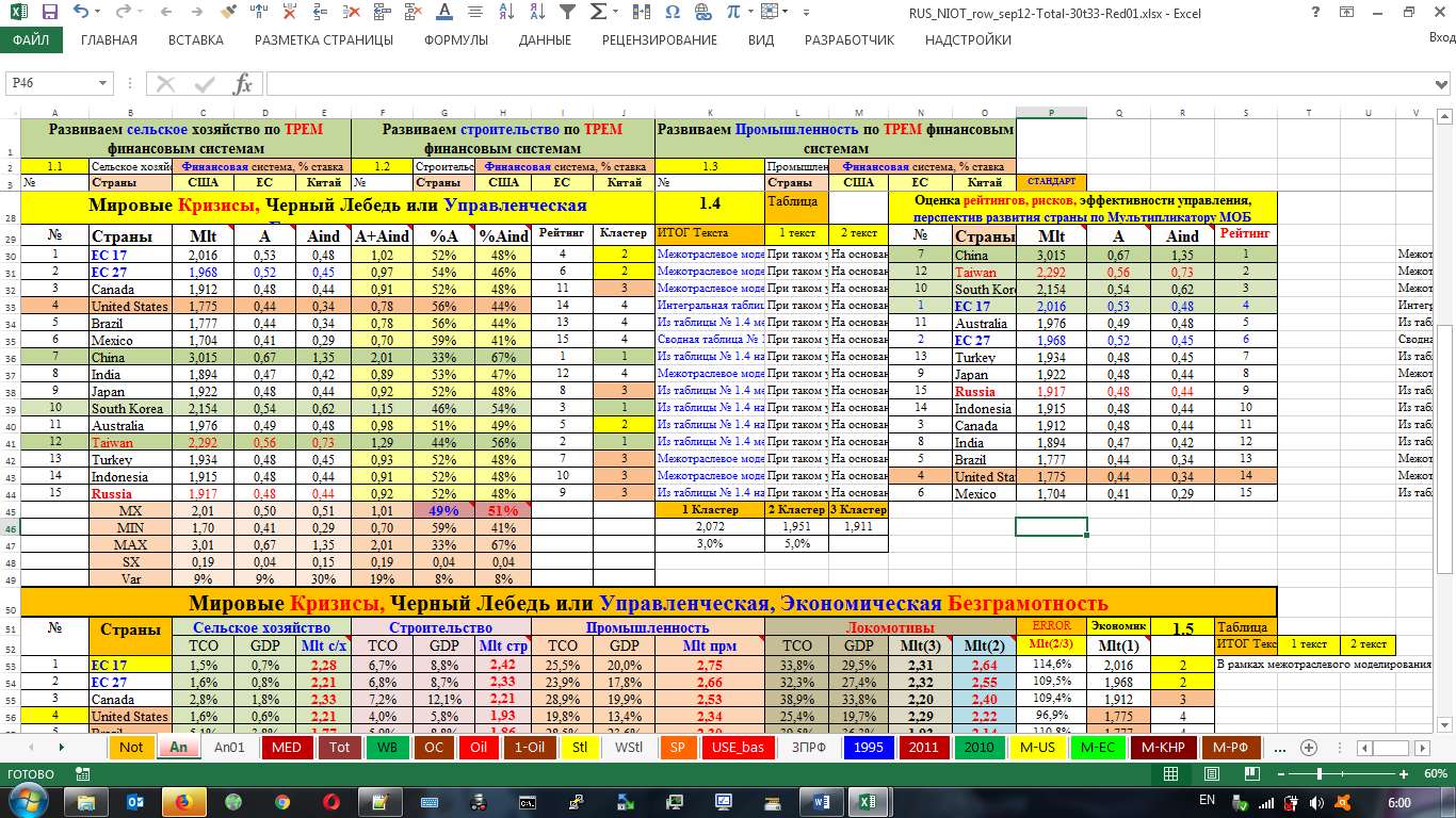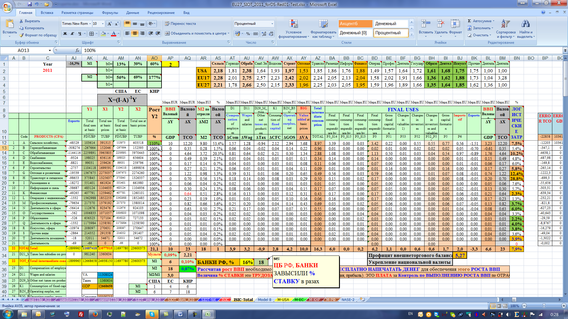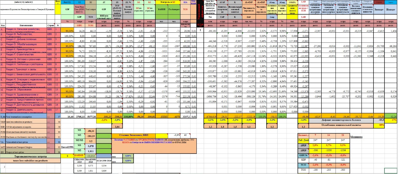 Выполним исследование по всем секторам экономики, применяя межотраслевой баланс 2014 года государства "Италия" (Таблица 2.52). В процессе межотраслевого моделирования, планируется развитие экономики по ВВП в размере 95,52 млрд. долл. США. Изменение ВВП составит величину 4,78 %. Величина мультипликативного воздействия на все секторы экономики составляет 2,341. Рост общего объёма продаж по всей экономике данного государства составит 223,62 млрд. долл. США. В рамках теории систем, выполнен анализ финансовых систем и монетарных политик США, ЕС, КНР. Проведены расчёты и определены величины денежных агрегатов: М1 (М0 + чеки, вклады до востребования, в том числе банковские дебетовые карты), М2 (М1 + срочные вклады). В процессе межотраслевого моделирования и планируемого изменения в экономике государства "Италия" по ВВП рассчитано повышение денежного агрегата М1 в размере 54,88 млрд. долл. США, а денежного агрегата М2 в размере 173,027 млрд. долл. США. C учетом трудозатрат банков, расчётно-кассовых центров ЦБ, страховых компаний, процентная ставки составит величину от 0,38 % до 3,01 %. Количество контролёров по финансовым потокам агрегатов М1 и М2 составит 22,259 тыс. чел. Из них: работники ЦБ, банков, расчётно-кассовых центров, страховых компаний - 22259 чел.; служащие государственных органов финансового контроля - 2453 чел.