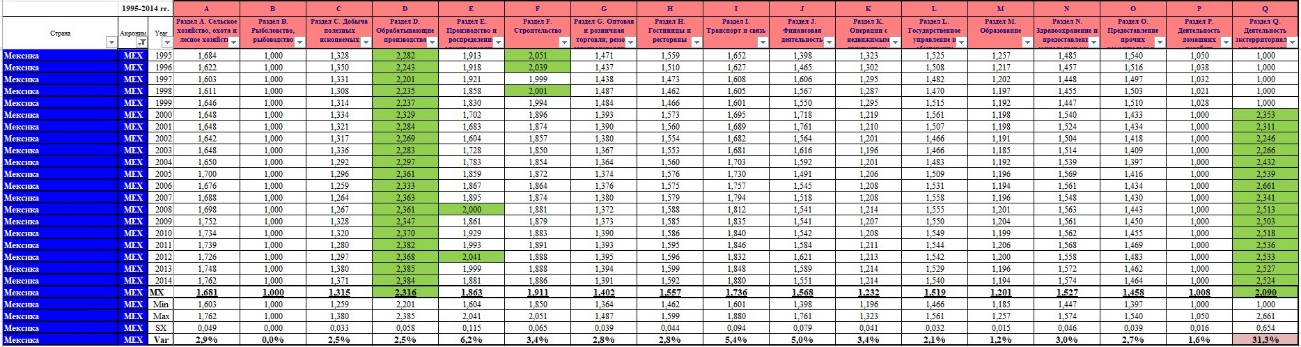 Из таблицы 2.59 на основе межотраслевого моделирования государства "Мексика" за период 1995-2014 гг., следует, что основные социально-экономические тактические приоритеты экономики государства, следующие: "Раздел А. Сельское хозяйство, охота и лесное хозяйство", величина среднего мультипликатора составляет 1,681. Минимальное мультипликативное воздействие равно 1,603. Размер максимального мультипликативного эффекта равен значению 1,762. Размер среднеквадратичного отклонения составляет 0,049. Размер вариации равен значению 2,9%. "Раздел Е. Производство и распределение электроэнергии, газа и воды", размер среднего мультипликатора составляет 1,863. Величина минимального мультипликативного воздействия составляет 1,604. Максимальная величина мультипликативного воздействия равна 2,041. Значение среднеквадратичного отклонения составляет 0,115. Размер вариации равен значению 6,2%. "Раздел F. Строительство", значение среднего мультипликатора равно 1,911. Минимальный мультипликатор составляет 1,85. Максимальный мультипликатор равен 2,051. Размер среднеквадратичного отклонения составляет 0,065. Размер вариации равен 3,4%. "Раздел D. Обрабатывающие производства", средний мультипликативный эффект равен 2,316. Минимальное мультипликативное воздействие составляет 2,201. Величина максимального мультипликатора составляет 2,385. Среднеквадратичное отклонение составляет 0,058. Размер вариации равен значению 2,5%. Для гармоничного развития государства необходимо развивать следующие стратегические социально-экономические направления экономики: "Раздел M. Образование", значение среднего мультипликатора равно 1,201. Значение минимального мультипликативного воздействия равно 1,185. Размер максимального мультипликативного воздействия составляет 1,257. Значение среднеквадратичного отклонения составляет 0,015. Размер вариации равен 1,2%. "Раздел N. Здравоохранение и предоставление социальных услуг", среднее мультипликативное воздействие составляет 1,527. Минимальное мультипликативное воздействие составляет 1,447. Величина максимального мультипликативного воздействия составляет 1,574. Значение среднеквадратичного отклонения составляет 0,046. Размер вариации равен 3%. К инвестиционным приоритетам социально-экономических отраслей экономики указанной страны не относятся ряд направлений, таких как: "Раздел G. Оптовая и розничная торговля; ремонт автотранспортных средств, мотоциклов, бытовых изделий и предметов личного пользования", размер среднего мультипликатора составляет 1,402. Минимальное мультипликативное воздействие составляет 1,364. Максимальное мультипликативное воздействие равно 1,487. Среднеквадратичное отклонение составляет 0,039. Размер вариации равен значению 2,8%. "Раздел J. Финансовая деятельность", среднее мультипликативное воздействие составляет 1,568. Минимальный мультипликатор равен 1,398. Величина максимального мультипликативного воздействия составляет 1,761. Значение среднеквадратичного отклонения равно 0,079. Размер вариации равен значению 5%.