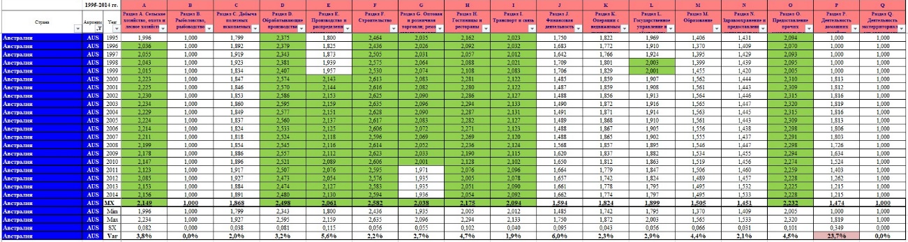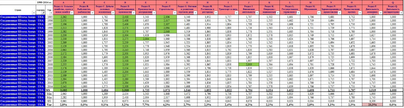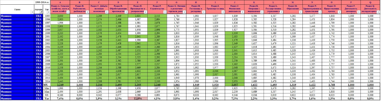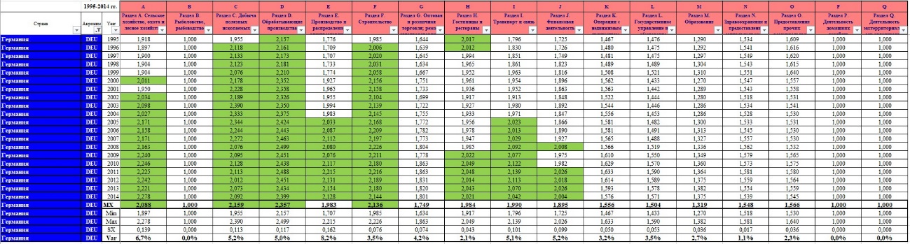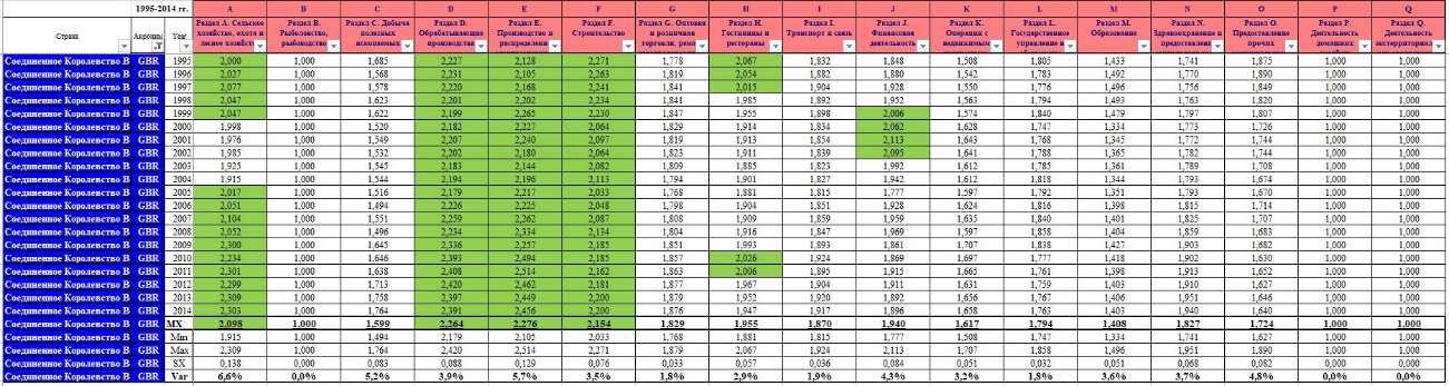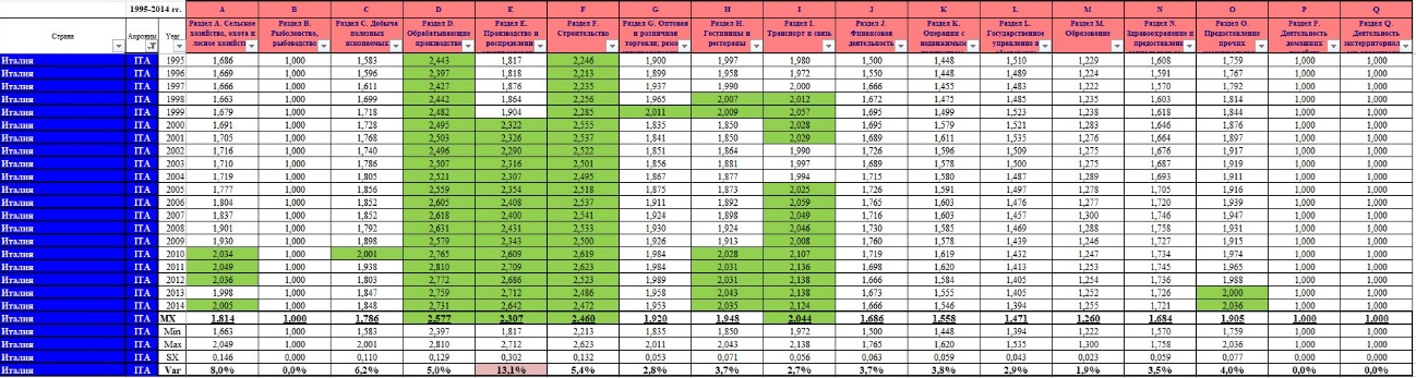 Исходя из межотраслевого исследования экономики государства "Италия" за период 1995-2014 гг., указанного в сводной таблице 2.50, следует, что основной движущей силой государства являются следующие социально-экономические тактические инвестиционные приоритеты экономики: "Раздел А. Сельское хозяйство, охота и лесное хозяйство", средняя величина мультипликативного эффекта равна 1,814. Значение минимального мультипликативного эффекта равно 1,663. Значение максимального мультипликатора равно 2,049. Размер среднеквадратичного отклонения равен 0,146. Вариация составляет 8%. "Раздел Е. Производство и распределение электроэнергии, газа и воды", размер среднего мультипликативного эффекта равен значению 2,307. Минимальный мультипликатор составляет 1,817. Величина максимального мультипликатора составляет 2,712. Размер среднеквадратичного отклонения равен значению 0,302. Размер вариации равен 13,1%. "Раздел F. Строительство", величина среднего мультипликатора составляет 2,46. Значение минимального мультипликативного воздействия равно 2,213. Максимальный мультипликативный эффект равен 2,623. Значение среднеквадратичного отклонения равно 0,132. Размер вариации равен значению 5,4%. "Раздел D. Обрабатывающие производства", величина среднего мультипликативного воздействия составляет 2,577. Минимальный мультипликативный эффект составляет 2,397. Максимальный мультипликатор составляет 2,81. Значение среднеквадратичного отклонения составляет 0,129. Размер вариации составляет 5%. К основным социально-экономическим стратегическим "локомотивам" экономики указанного государства относятся: "Раздел M. Образование", величина среднего мультипликатора составляет 1,26. Минимальное мультипликативное воздействие составляет 1,222. Значение максимального мультипликативного эффекта равно 1,3. Размер среднеквадратичного отклонения равен 0,023. Значение вариации составляет 1,9%. "Раздел N. Здравоохранение и предоставление социальных услуг", значение среднего мультипликативного воздействия равно 1,684. Размер минимального мультипликативного эффекта равен значению 1,57. Максимальный мультипликативный эффект составляет 1,758. Размер среднеквадратичного отклонения равен 0,059. Вариация составляет 3,5%. Информационно-вспомогательными секторами экономики данной страны являются: "Раздел G. Оптовая и розничная торговля; ремонт автотранспортных средств, мотоциклов, бытовых изделий и предметов личного пользования", значение среднего мультипликативного воздействия равно 1,92. Минимальный мультипликативный эффект равен 1,835. Максимальное мультипликативное воздействие составляет 2,011. Размер среднеквадратичного отклонения равен 0,053. Значение вариации составляет 2,8%. "Раздел J. Финансовая деятельность", значение среднего мультипликативного эффекта равно 1,686. Значение минимального мультипликативного воздействия равно 1,5. Максимальный мультипликативный эффект составляет 1,765. Размер среднеквадратичного отклонения составляет 0,063. Размер вариации равен 3,7%.