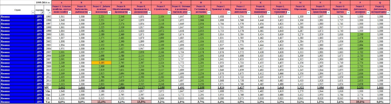 Исходя из межотраслевого исследования экономики государства "Япония" за период 1995-2014 гг., указанного в сводной таблице 2.53, следует, что к основным социально-экономическим тактическим инвестиционным приоритетам государства относятся: "Раздел А. Сельское хозяйство, охота и лесное хозяйство", среднее мультипликативное воздействие составляет 2,002. Минимальный мультипликатор равен 1,848. Размер максимального мультипликативного эффекта равен значению 2,209. Среднеквадратичное отклонение составляет 0,121. Размер вариации равен 6%. "Раздел Е. Производство и распределение электроэнергии, газа и воды", значение среднего мультипликативного эффекта равно 2,117. Величина минимального мультипликатора составляет 1,817. Максимальный мультипликатор равен 2,597. Размер среднеквадратичного отклонения равен значению 0,286. Значение вариации составляет 13,5%. "Раздел F. Строительство", средний мультипликативный эффект составляет 2,155. Минимальная величина мультипликативного воздействия равна 2,072. Величина максимального мультипликатора составляет 2,324. Размер среднеквадратичного отклонения равен 0,069. Вариация составляет 3,2%. "Раздел D. Обрабатывающие производства", величина среднего мультипликатора составляет 2,508. Минимальная величина мультипликативного эффекта равна 2,321. Значение максимального мультипликатора равно 2,795. Размер среднеквадратичного отклонения равен значению 0,152. Размер вариации равен значению 6,1%. Основными социально-экономическими стратегическими инвестиционными приоритетами государства, связанными с кадровым потенциалом, являются: "Раздел M. Образование", величина среднего мультипликативного воздействия составляет 1,322. Минимальная величина мультипликативного воздействия равна 1,279. Величина максимального мультипликативного воздействия составляет 1,412. Среднеквадратичное отклонение составляет 0,041. Размер вариации равен 3,1%. "Раздел N. Здравоохранение и предоставление социальных услуг", среднее мультипликативное воздействие равно 1,886. Размер минимального мультипликатора составляет 1,844. Размер максимального мультипликатора составляет 1,95. Значение среднеквадратичного отклонения равно 0,028. Размер вариации составляет 1,5%. Отметим, что к развивающимся за счёт основных приоритетов указанной страны, информационно-вспомогательными секторами экономики являются: "Раздел G. Оптовая и розничная торговля; ремонт автотранспортных средств, мотоциклов, бытовых изделий и предметов личного пользования", размер среднего мультипликативного эффекта равен значению 1,691. Размер минимального мультипликативного эффекта равен значению 1,647. Максимальная величина мультипликативного воздействия равна 1,772. Размер среднеквадратичного отклонения составляет 0,033. Размер вариации равен 1,9%. "Раздел J. Финансовая деятельность", средний мультипликативный эффект составляет 1,627. Минимальный мультипликатор составляет 1,551. Значение максимального мультипликативного воздействия равно 1,76. Среднеквадратичное отклонение составляет 0,073. Размер вариации равен 4,5%.