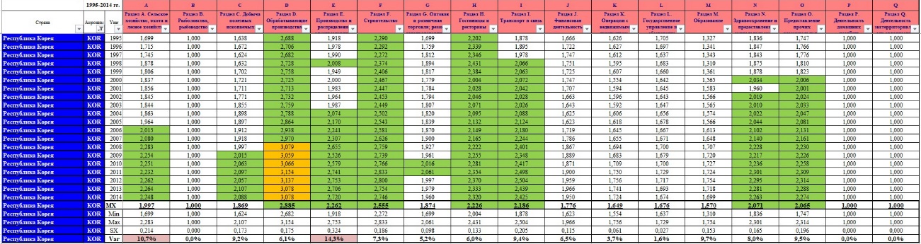 В таблице 2.56 отражён результат межотраслевого моделирования государства "Республика Корея" за период 1995-2014 гг., свидетельствующий о том, что ведущими социально-экономическими тактическими инвестиционными приоритетами государства являются следующие секторы экономики: "Раздел А. Сельское хозяйство, охота и лесное хозяйство", значение среднего мультипликативного воздействия равно 1,997. Значение минимального мультипликативного эффекта равно 1,699. Значение максимального мультипликативного воздействия равно 2,283. Размер среднеквадратичного отклонения равен значению 0,214. Вариация составляет 10,7%. "Раздел Е. Производство и распределение электроэнергии, газа и воды", размер среднего мультипликатора составляет 2,262. Минимальный мультипликативный эффект составляет 1,918. Значение максимального мультипликативного воздействия равно 2,753. Среднеквадратичное отклонение составляет 0,324. Размер вариации равен значению 14,3%. "Раздел F. Строительство", величина среднего мультипликатора составляет 2,555. Минимальное мультипликативное воздействие равно 2,272. Размер максимального мультипликатора составляет 2,833. Значение среднеквадратичного отклонения равно 0,186. Размер вариации составляет 7,3%. "Раздел D. Обрабатывающие производства", величина среднего мультипликативного воздействия составляет 2,885. Минимальный мультипликативный эффект составляет 2,682. Значение максимального мультипликативного эффекта равно 3,154. Размер среднеквадратичного отклонения равен 0,175. Размер вариации равен значению 6,1%. Ведущими социально-экономическими стратегическими инвестиционными приоритетами государства, отвечающими за развитие кадров, являются следующие секторы экономики: "Раздел M. Образование", значение среднего мультипликативного эффекта равно 1,57. Минимальный мультипликатор равен 1,31. Размер максимального мультипликативного эффекта равен значению 1,754. Размер среднеквадратичного отклонения составляет 0,153. Размер вариации составляет 9,7%. "Раздел N. Здравоохранение и предоставление социальных услуг", среднее мультипликативное воздействие составляет 2,071. Значение минимального мультипликатора равно 1,836. Значение максимального мультипликатора равно 2,301. Размер среднеквадратичного отклонения равен значению 0,165. Размер вариации равен значению 8%. К инвестиционным приоритетам социально-экономических отраслей экономики указанной страны не относятся ряд направлений, таких как: "Раздел G. Оптовая и розничная торговля; ремонт автотранспортных средств, мотоциклов, бытовых изделий и предметов личного пользования", значение среднего мультипликативного воздействия равно 1,874. Минимальный мультипликативный эффект составляет 1,699. Значение максимального мультипликатора равно 2,061. Размер среднеквадратичного отклонения составляет 0,098. Размер вариации равен значению 5,2%. "Раздел J. Финансовая деятельность", средний мультипликатор равен 1,776. Значение минимального мультипликатора равно 1,623. Максимальная величина мультипликативного воздействия равна 1,966. Размер среднеквадратичного отклонения равен значению 0,115. Размер вариации равен значению 6,5%.