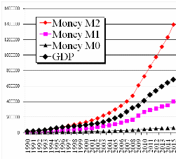 Исследования показывает, что увеличение ВВП равно величине 781,589 млрд. долл. США. С целью обеспечения указанного роста необходимо произвести эмиссию электронным образом 1415,848 млрд. долл. США, которые государство превращает в золотовалютные активы в размере 330,682 млрд. долл. США. Пример показывает, как из «воздуха» формируются полноценные золотовалютные резервы любого государства.