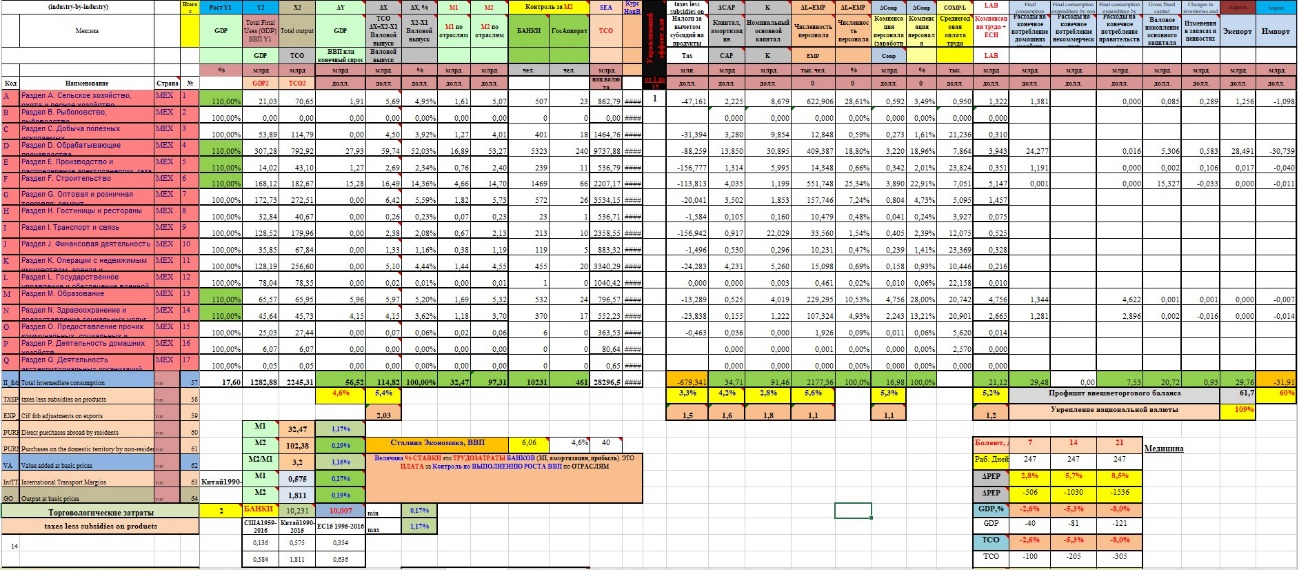 Исследуем все отрасли экономики на основе межотраслевого баланса 2014 года государства "Мексика" (Таблица 2.60). Осуществляя межотраслевое моделирование, планируется подавление экономики по ВВП в размере -56,52 млрд. долл. США. Изменение ВВП составит величину -4,61 %. Мультипликатор по всем отраслям экономики равен 2,03. Убыль суммарного объёма продаж по всем отраслям экономики данного государства равна величине -114,82 млрд. долл. США.