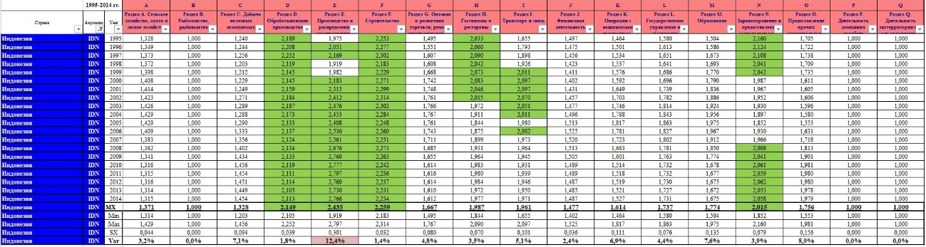 В соответствии с межотраслевым исследованием экономики государства "Индонезия" за период 1995-2014 гг., отражённого в таблице 2.44, следует, что к движущей тактической социально-экономической силе государства относятся: "Раздел А. Сельское хозяйство, охота и лесное хозяйство", величина среднего мультипликативного воздействия составляет 1,371. Минимальный мультипликативный эффект составляет 1,314. Максимальный мультипликативный эффект составляет 1,429. Размер среднеквадратичного отклонения равен значению 0,044. Размер вариации равен значению 3,2%. "Раздел Е. Производство и распределение электроэнергии, газа и воды", средняя величина мультипликативного эффекта равна 2,435. Величина минимального мультипликатора составляет 1,919. Максимальное мультипликативное воздействие составляет 2,797. Размер среднеквадратичного отклонения составляет 0,301. Размер вариации равен 12,4%. "Раздел F. Строительство", величина среднего мультипликатора составляет 2,259. Размер минимального мультипликатора составляет 2,183. Максимальный мультипликатор равен 2,314. Размер среднеквадратичного отклонения равен значению 0,032. Размер вариации составляет 1,4%. "Раздел D. Обрабатывающие производства", значение среднего мультипликатора равно 2,149. Минимальная величина мультипликативного воздействия равна 2,105. Величина максимального мультипликативного воздействия составляет 2,252. Значение среднеквадратичного отклонения составляет 0,039. Размер вариации равен значению 1,8%. С целью формирования эффективного кадрового потенциала, необходимо развивать следующие стратегические социально-экономические направления экономики: "Раздел M. Образование", средний мультипликативный эффект составляет 1,774. Минимальное мультипликативное воздействие равно 1,504. Значение максимального мультипликативного воздействия равно 1,975. Размер среднеквадратичного отклонения равен значению 0,135. Вариация составляет 7,6%. "Раздел N. Здравоохранение и предоставление социальных услуг", размер среднего мультипликатора составляет 2,015. Минимальная величина мультипликативного воздействия равна 1,852. Величина максимального мультипликатора составляет 2,16. Значение среднеквадратичного отклонения равно 0,079. Размер вариации равен значению 3,9%. К информационно-вспомогательным секторам экономики, развивающихся за счёт основных инвестиционных приоритетов указанного государства, относятся: "Раздел G. Оптовая и розничная торговля; ремонт автотранспортных средств, мотоциклов, бытовых изделий и предметов личного пользования", величина среднего мультипликативного воздействия составляет 1,667. Размер минимального мультипликативного воздействия составляет 1,495. Размер максимального мультипликативного воздействия составляет 1,767. Среднеквадратичное отклонение составляет 0,08. Значение вариации составляет 4,8%. "Раздел J. Финансовая деятельность", среднее мультипликативное воздействие равно 1,477. Минимальная величина мультипликативного воздействия равна 1,402. Максимальная величина мультипликативного воздействия равна 1,525. Размер среднеквадратичного отклонения равен 0,036. Значение вариации составляет 2,4%.
