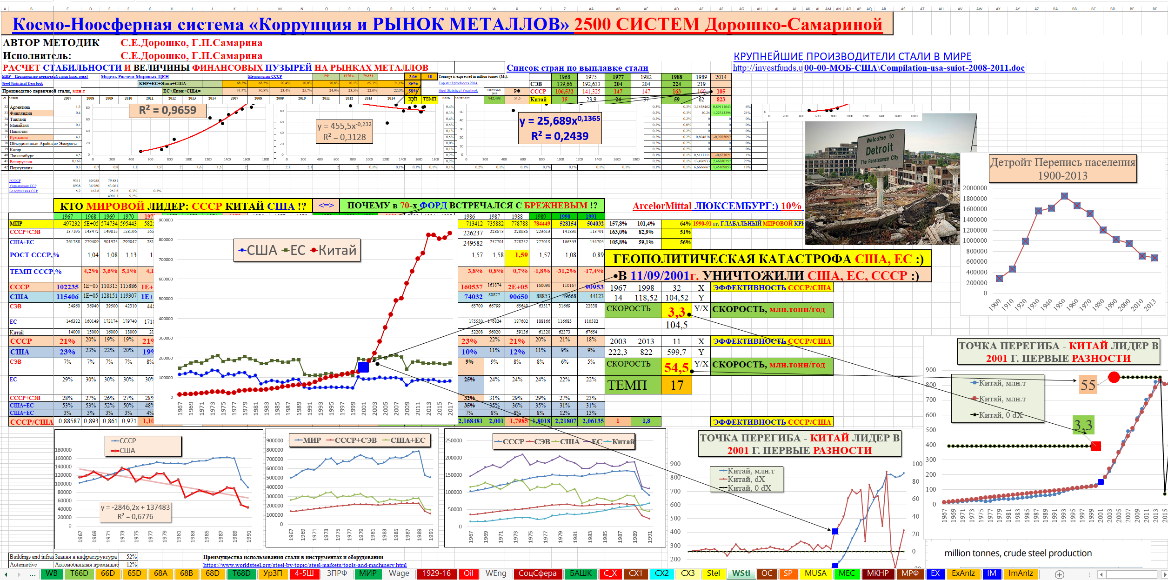 Уничтожение США, ЕС, СССР-СЭВ реализуется через механизмы плановой ликвидации базовых отраслей тяжёлой промышленности, инженерной инфраструктуры, а также основного капитала, основных средств или ещё точнее физической ликвидации промышленности по производству средств производства. По космо-ноосферным системам, нейронным геополитическим, геоэкономическим моделям тяжёлой промышленности, стали, цемента наглядно и убедительно доказана подготовка к убийству «белого» многонационального славянского населения, известного как «золотой» миллиард и закрытие проектов государств США, Европы, СССР/СЭВ, Израиля, а далее Японии, Южной Кореи, Китая, Индии и прочих.