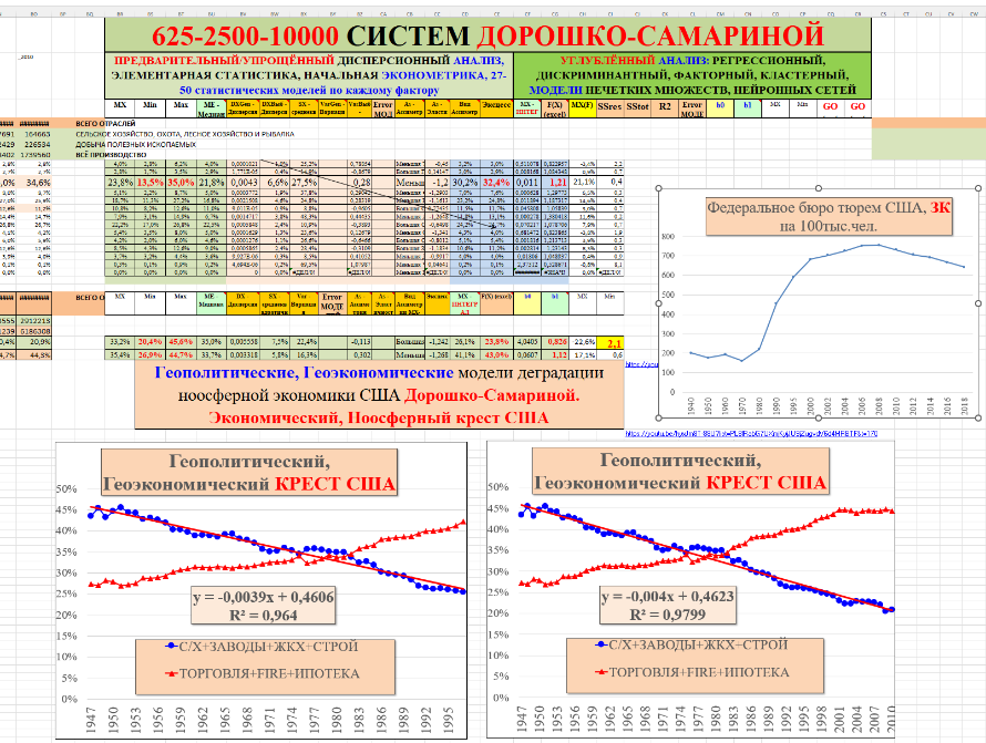 По уточнённым моделям авторов за период 1950-2020гг. в рамках космо-ноосферных систем Дорошко-Самариной можно утверждать, что в США к 1954 г. было уничтожено элитное классическое образование, а также образование для американского народа. Из моделей авторов видно, что из-за деградации образования в США с 6 сентября 1954 г. началось убийство экономики, промышленности и остатков образования. Авторы отдельно подчёркивают, что этот процесс осуществляется по заранее подготовленному плану с высокой последовательностью, что подтверждается показателем коэффициента детерминации R2=0.94. Этот процесс уничтожения или краха экономики США по моделям авторов был закончен в 01/06/2011 г. Промышленность США была уничтожена/сокращена в 4 раза к 29/05/2018 г. Этот плановый процесс ликвидации государственности США осуществлялся последовательно, что подтверждает коэффициент детерминации R2=0.98.