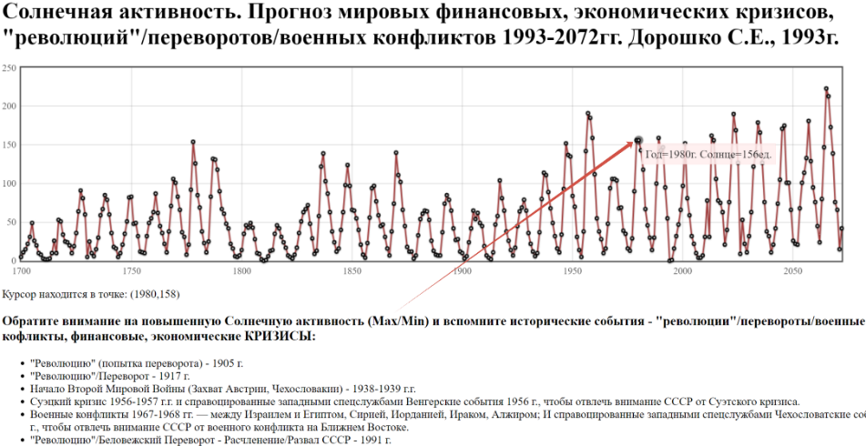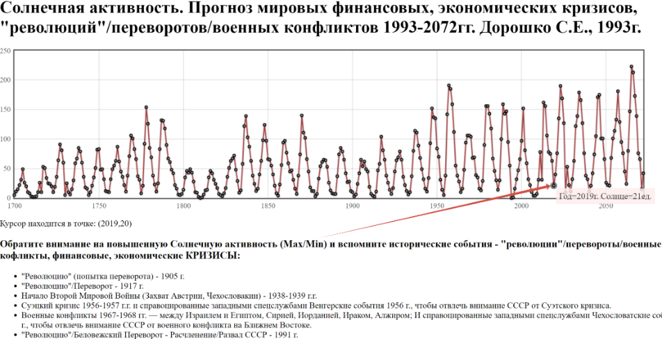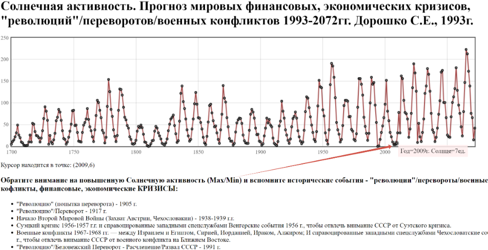 Напомним, что неурожаи во всём мире наблюдались: на спаде солнечной активности в 1921-1922гг. ближе к минимуму, связанные с засухой, а также при спаде солнечной активности 1932-1933гг. ближе к минимуму. Следует вспомнить о климатических причинах начала «Великой французской революции» 1789г. в период фазы подъёма солнечной активности 1786г. и максимума 1787-1788гг. и фазы спада солнечной активности 1789-1794гг. Напомним, что «…В 1787 году наблюдался недород шёлковых коконов (максимум солнца 1787г.). Это повлекло за собой сокращение лионского шёлкоткацкого производства. В конце 1788 года только в Лионе насчитывалось 20—25 тыс. безработных (максимум солнца 1788г.). От сильного града в июле 1788 года пострадал урожай зерновых во многих провинциях. Крайне суровая зима 1788/89 годов погубила многие виноградники и часть урожая. Цены на продовольствие поднялись…» (http://economics-21.narod.ru/prog/riskanaliz/sun-analiz.html).