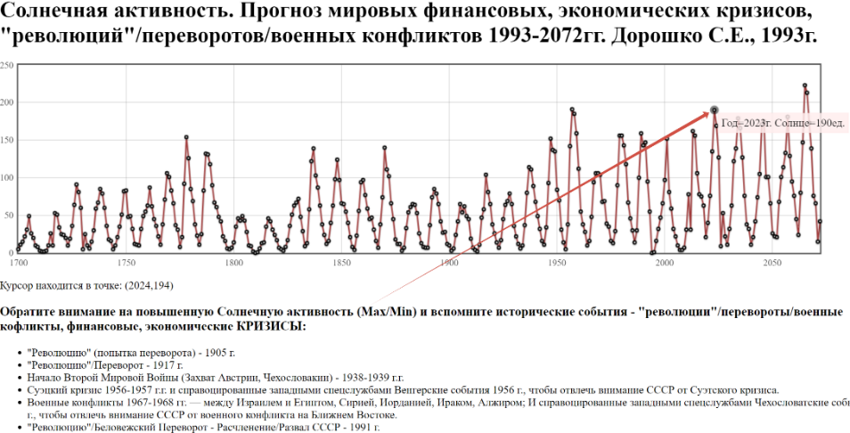 Обратите внимание на прогнозы С.Е.Дорошко, Г.П.Самариной по неурожаям на западе, связанные с засухами в период фазы подъёма солнечной активности в 2021-2022г. ближе к максимуму 2023г.: «…Летом 2022 года страны Европы столкнулись с рекордной жарой и угрозой серьёзной засухи. В середине июля Еврокомиссия оценивала, что проблема может коснуться половины территории Евросоюза. В части регионов также значительна угроза лесных пожаров. Снижение уровня воды в реках, в частности в Рейне, негативно сказывается на ситуации в энергетике, проблемы возникают с доставкой грузов. Франция в августе сформировала для борьбы с самой серьёзной в истории засухой особый антикризисный штаб…» (https://lenta.ru/tags/story/zasuha/). И далее: «…Самым жарким в Европе оказалось лето 2022 года. Тогда из-за аномально высокой температуры были перегружены системы энергоснабжения и снизилось сельскохозяйственное производство…» (https://lenta.ru/news/2023/06/30/zhara_zhdet/). Поэтому в рамках космо-ноосферных систем Дорошко-Самариной на базе одного из космо-ноосферных комплексов С.Е.Дорошко, Г.П.Самарина «Ноосферная система «Космос, Солнце и Кризисы» Дорошко-Самариной» (http://economics-21.narod.ru/Book/book-17/b17.html#ds01) несложно было дать прогноз на 2023 г. и как активно политики, блогеры и диванные эксперты будут обсуждать «Зерновые сделки» по Украине. В рамках космо-ноосферных систем, моделей Дорошко-Самариной зерно в 2023 г. нужно было западу (ЕС, США) в связи с засухой и неурожаем в 2021-2022 гг., а запад по сценариям Голливуда по традиции прикрылся как всегда третьим миром, в т. ч. Африкой.