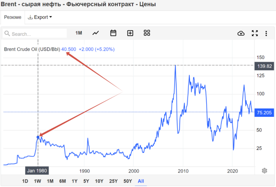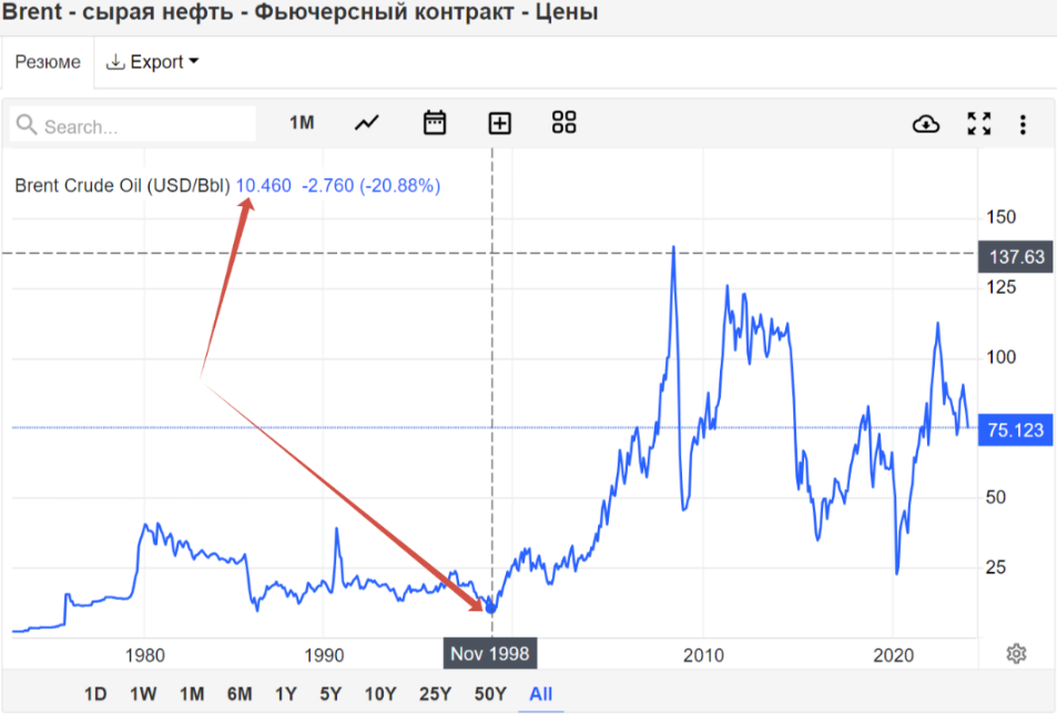 Например, любому курсанту Академии несложно это доказать, анализируя мировой энергетический рынок нефти. Для этого необходимо зайти в интернет-базу данных показателя «Brent - сырая нефть - Фьючерсный контракт – Цены» (https://ru.tradingeconomics.com/commodity/brent-crude-oil ) и найти 2008 год, как это показано на графике.