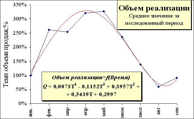 В целом, темпы платежеспособного рыночного спроса в течение года меняются от 80% до 125% (см. рис. 1.11.). В это же время колебание цен находится в диапазоне от 32 до 38 рублей. При этом точкам максимального спроса соответствуют максимальные цены, и наоборот, точкам минимального спроса соответствуют минимальные цены. Все это и характеризует полное отсутствие сдвигов кривых цены и спроса (фазовый сдвиг равен 0, т.е. отсутствует).