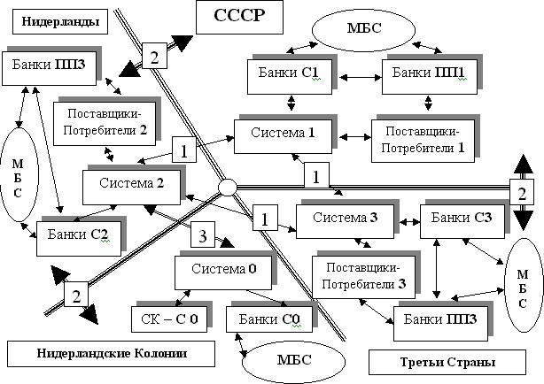 Банки С1, С2, С3 – банки полностью или частично, принадлежащие предприятиям Система 1, 2, 3. Практически это «карманные» банки предприятий системы, через их счета только по товарным контрактам проходило в ценах 80-х годов более 100 млрд. долл. США в год. Они взаимодействуют с банками предприятий поставщиков-потребителей. Банки ПП1-ПП3, как напрямую, так и через международную банковскую систему – МБС. Таким образом, еще более (минимум в 2-5 раз) они расширяли свои кредитные, спекулятивные возможности. Им сообщалось заранее о планируемых финансовых акциях СССР против Запада для обеспечения их спекулятивных успехов на товарных, финансовых, ресурсных рынках.