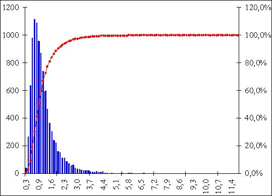 В январе-феврале спрос на строительные товары на основной территории России традиционной низкий, поэтому большинство продавцов - их маркетинговые, логистические отделы стараются распродать излишки на своих складах (производственный персонал в большинстве фирмах находится на рождественских каникулах), оттого цены у продавцов достаточно низкие. Благодаря явному преобладанию продавцов над покупателями (рынок продавцов), они в основном конкурируют между собой, на рынке преобладают более низкие средние цены. В этот период продавцы начинают ощущать, что на рынке наметилась тенденция роста объемов продаж, она в феврале выросла со 100% до 120%. Как следствие они пытаются поднять цены, в результате гистограмма – ценовая функция распределения начинает медленно смещаться вправо. В последующие месяцы до апреля включительно наблюдалась устойчивая динамика роста, гистограмма смещается вправо. При этом она прошла одну критическую точку, что наглядно видно на графике, в апреле темп роста спроса замедлился. Любой профессиональный аналитик знает – это не к добру, большинство покупателей почти полностью обеспечили свои производства необходимыми материалами, комплектацией, оборудованием и можно ожидать в ближайшем "завтра" насыщение рынка и начала падения спроса и объемов продаж. В результате рынок начинает свое обратное колебание, гистограмма приобретает достаточно симметричную форму.