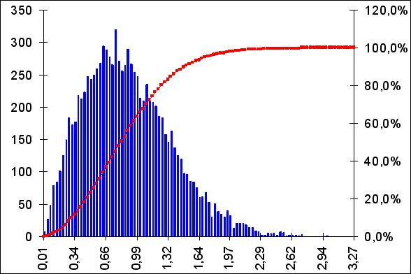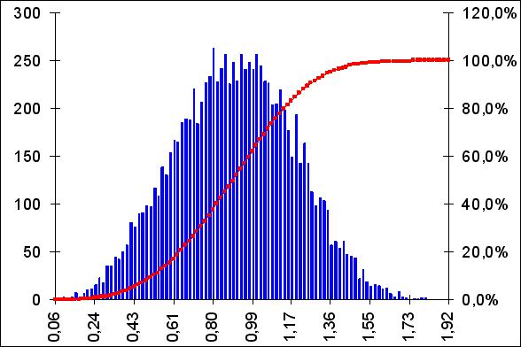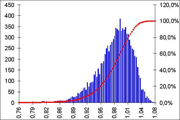 Необходимость моделирования вызвано неизбежными ошибками и как следствие смещениями в оценках ценовых коридоров, которые возникают в процессе исследования рынка. Поэтому очень сложно определить достоверную динамику цен на рынке на уровне не более 5-10% (доля ошибки). В тоже время, используя модифицированный, нашим коллективом, метод Монте-Карло в совокупности с оценками экспертов, можно с большей степенью достоверности построить вероятностную рыночную ценовую модель исследуемой товарной группы. В частности, все данные и графики, представленные в табл. 1.24., были получены с помощью модифицированного метода Монте-Карло. Ценовую модель, в дальнейшем, можно использовать при формировании плановых показателей и дефиниции динамики фондовых потоков на последующие плановые периоды, установив по каждой из товарных групп силу их влияния и чувствительность по отношению к ним своих плановых показателей. В результате это позволит более корректно исследовать и в дальнейшем управлять не только фондовыми, финансовыми потоками своей фирмы, но и формировать контрактную форму взаимодействия с потенциальными поставщиками и совместно с ними вырабатывать будущие ценовые коридоры, поставляемых ими товаров и услуг. Будут максимально объективно создаваться не только свои плановые показатели, но и договорным образом они будут увязаны с ценовыми показателями потенциальных поставщиков, например, в виде "револьверных" кредитов, фьючерсных контрактов и т.д.