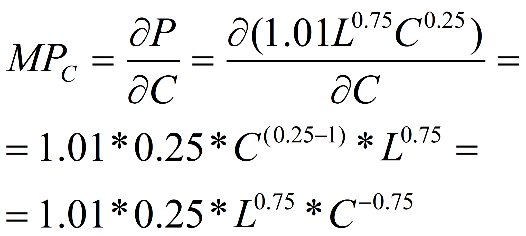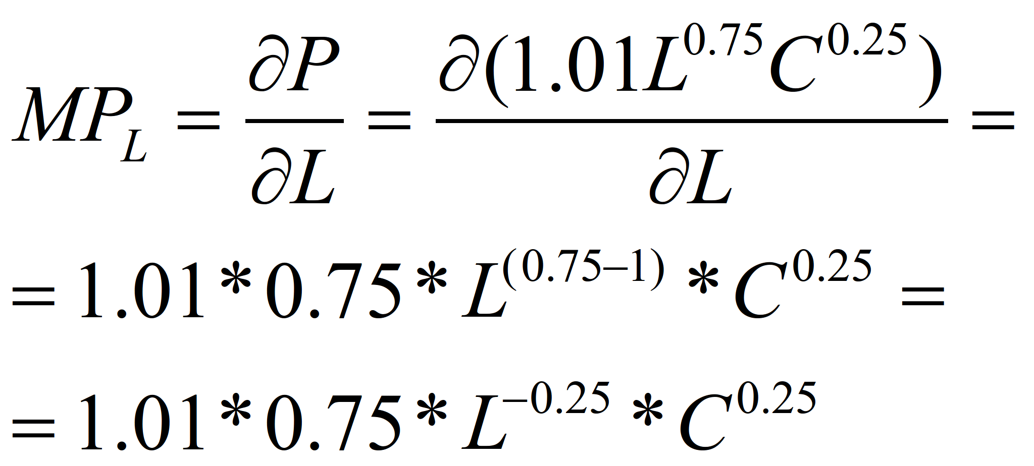 Помните вы изучали функцию спроса QD= f (P), QD= f (P, t, Tp, I,РR, E, N, А, О)), при этом говорилось, что спрос зависит от многих факторов. Решение такого уравнения возможно при условии, если мы фиксируем все переменные t, Tp, I,РR, E, N, А, О=const и изучаем только одну переменную QD= f (P, const). Таким образом, рассматривается частный случай общего уравнения, или как говорят математики: "Сначала возьмем частную производную по Р". Производственная функция также зависит от многих факторов P'=1.01L0.75C0.25, в нашем случае от L и С. Поэтому …