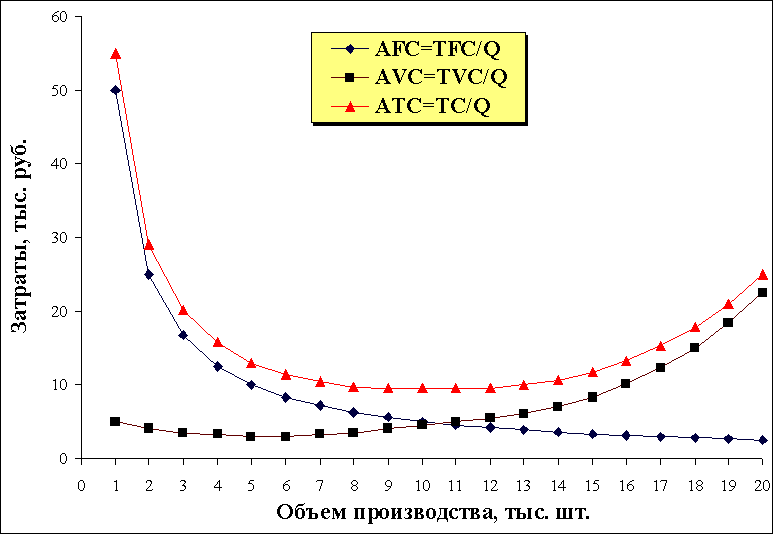 Затраты делят на две большие группы - постоянные (fixed) и переменные (variable). Они относятся к общим затратам каждого вида, отнесенным к общему объему производства для данной производственной функции.