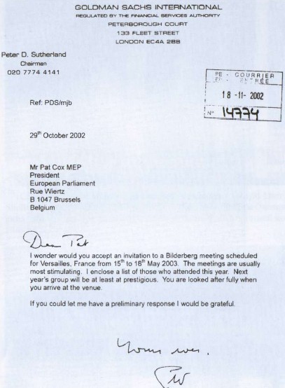 Приглашение на заседание Бильдербергского клуба президента компании «Goldman Sachs», члена совета директоров BP и члена совета правления Бильдербергского клуба Питера Сазерленда и председателя Европейского парламента Пата Кокса.