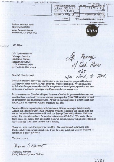 Обращение NASA в компанию «Northwest Airlines» с просьбой передать данные о миллионах ее клиентов (имена, адреса, маршруты поездок и номера кредитных карточек) для осуществления исследования, схожего с технологией «добычи данных». На сегодняшний день эта практика, против которой я выступил уже не-скольких лет назад, стала обычной в США и скоро станет чем-то привычным в Европе.