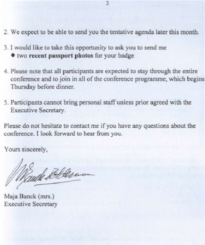 Письмо Майи Бэнк, исполнительного секретаря и единствен-ной служащей Бильдербергского клуба, председателю Европейского парламента Пату Коксу, в котором она выражает благодарность за согласие принять участие в заседании 2003 года. Любопытно то, что имени Кокса в списке официальных приглашенных нет.