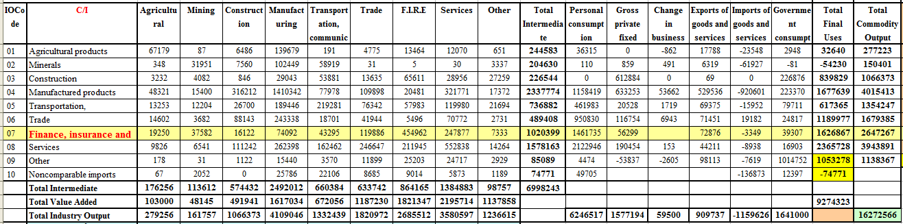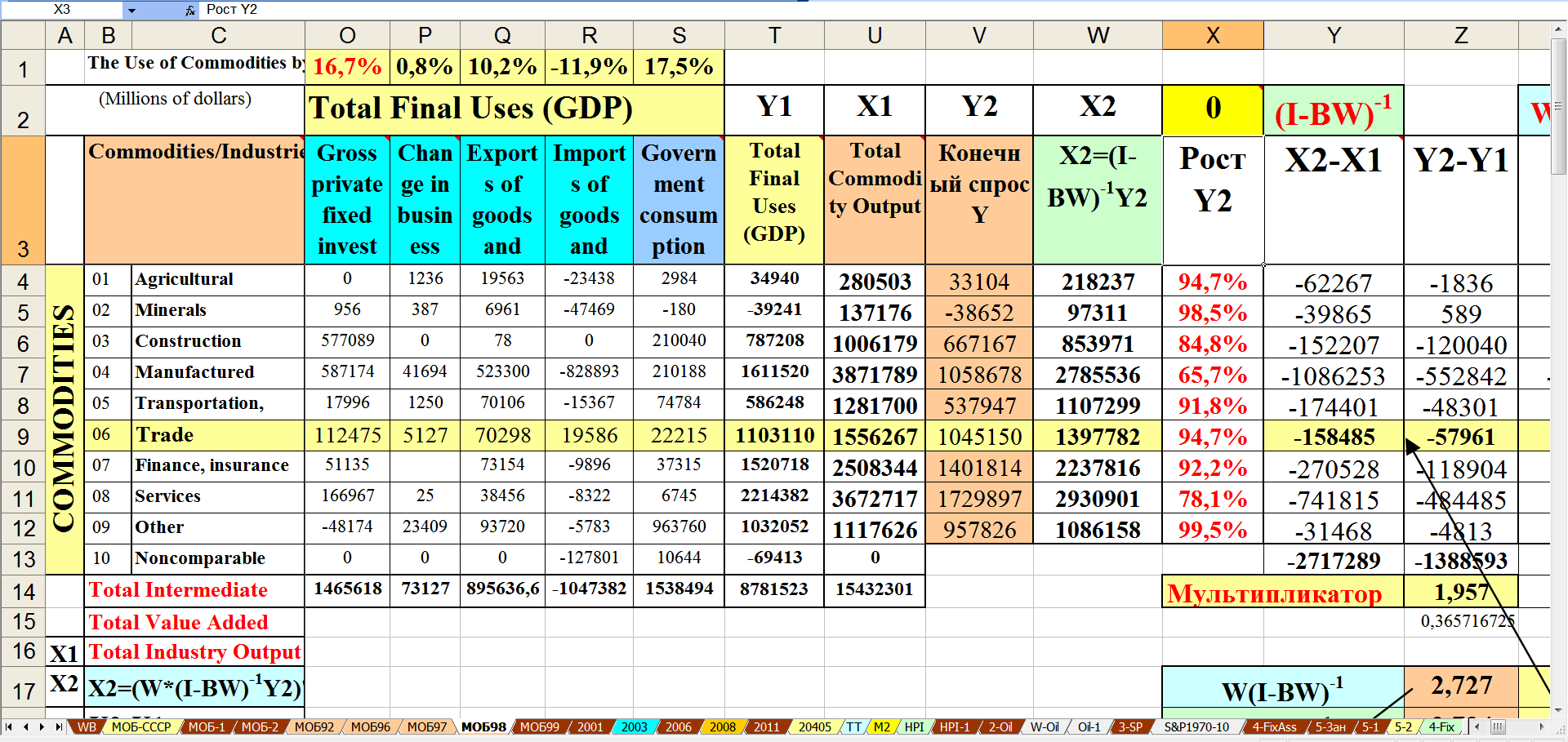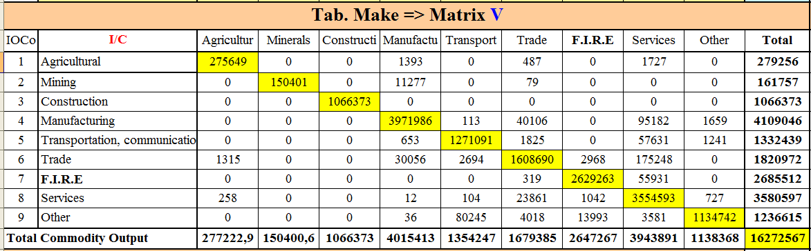 Как видно из таблицы Make (Рис. 6), по диагонали расположены условно чистые отрасли (Industries). Например сельское хозяйство — отрасль "Agricultural" производит продукцию/товары "Agricultural".
