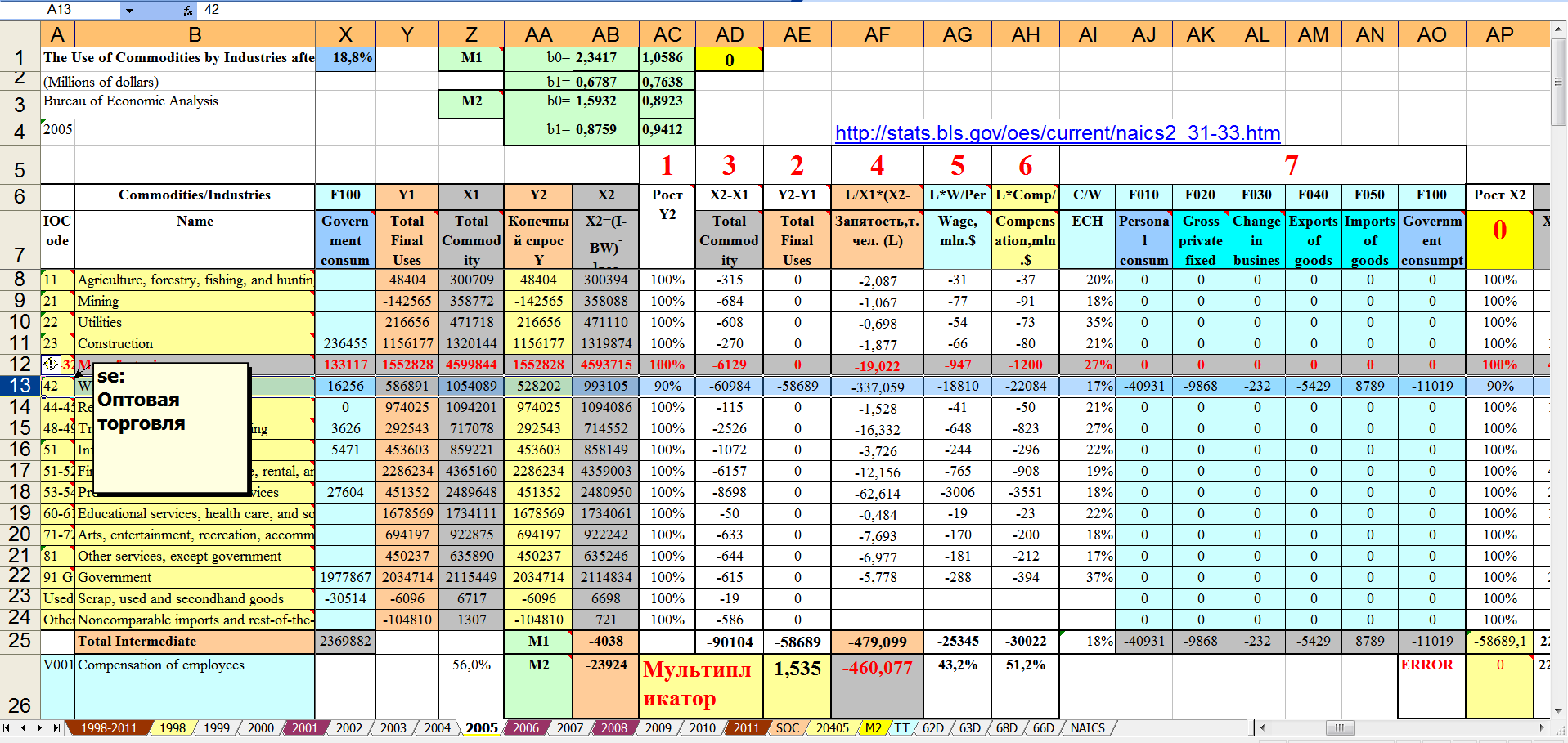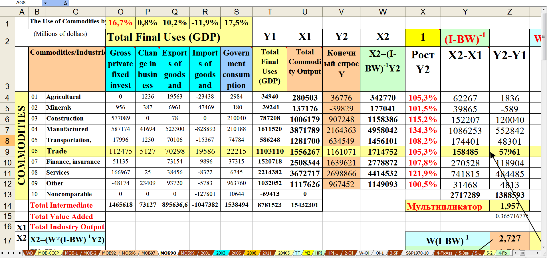 Матрица прямых затрат B*W вида товар-товар (Commodity-by-Commodity), представлена в таблице Matrix B*W.
