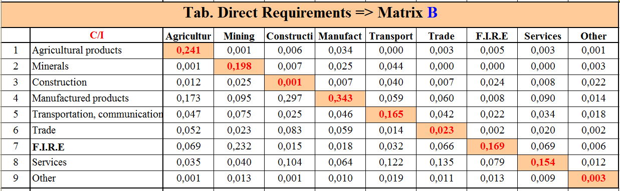 Первая колонка отрасль "Agricultural" b11=67179/279256=0,241, b21=348/279256=0,001, .... , b91=(178+67)/279256=0,001