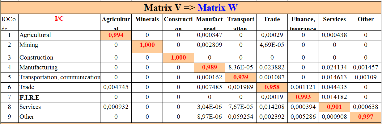 Для вычисления матрицы W необходимо разделить каждую строку на входе wij=Xij/Xj на всего товарной продукции (Total Commodity Output), на выходы (output), (матрица Make). Матрица Make используется, чтобы вычислить входы, которые имели обыкновение производить вторичные продукты отраслями, применяя предположение об однородности технологии отраслей.
