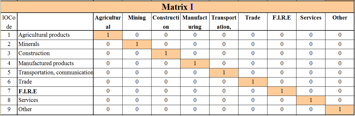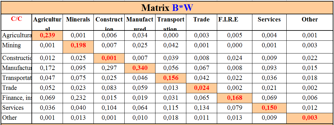 Первая колонка отрасль "Agricultural" w11=275649/277222,9=0,994, w21=0/277222,9=0, ...., w61=1315/277222,9=0,004745, .... , w81=258/279256=0,000932, w91=0/277222,9=0