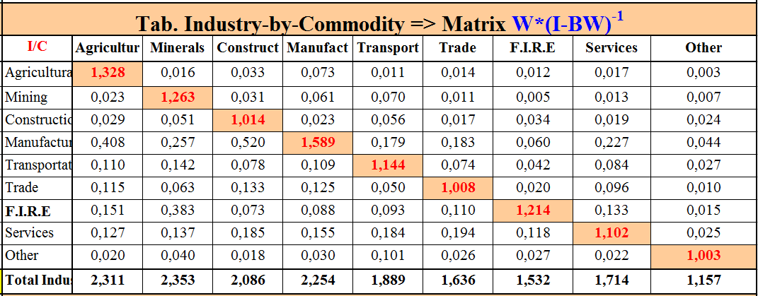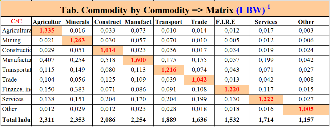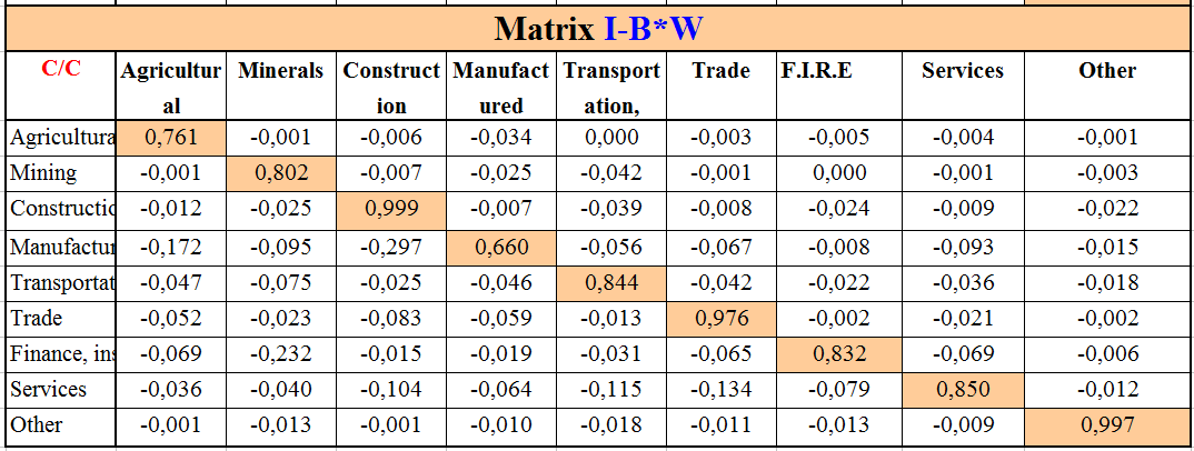 Это обратная матрица, чтобы получить таблицу полных затрат для модели товар-товаром (Commodity-by-Commodity), (см. Matrix (I-BW)-1)