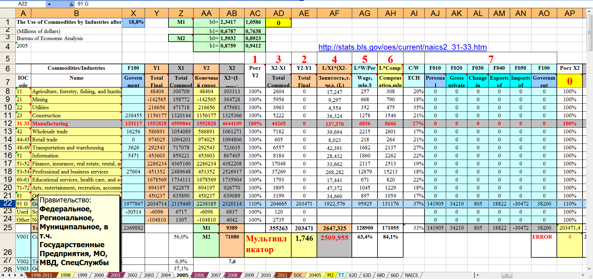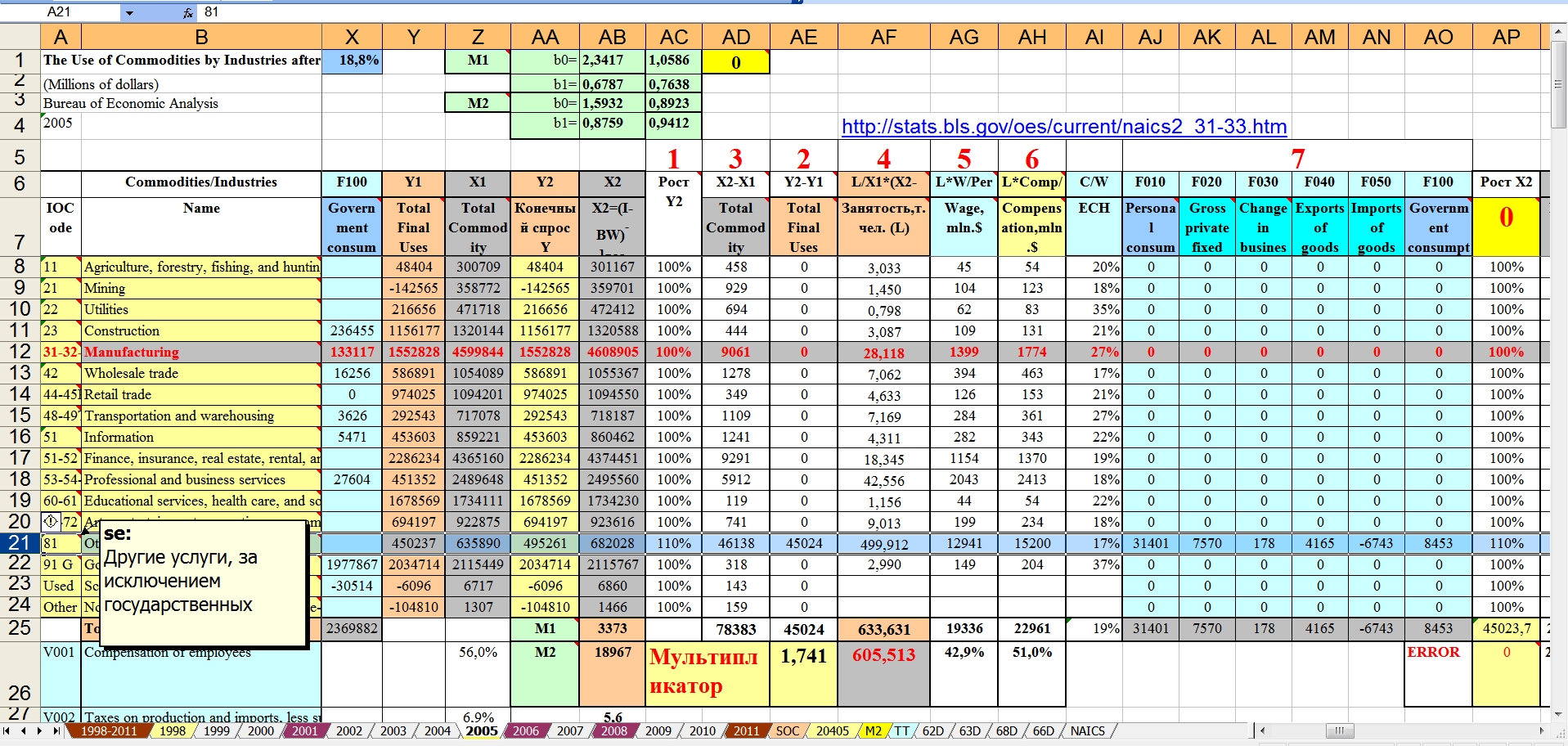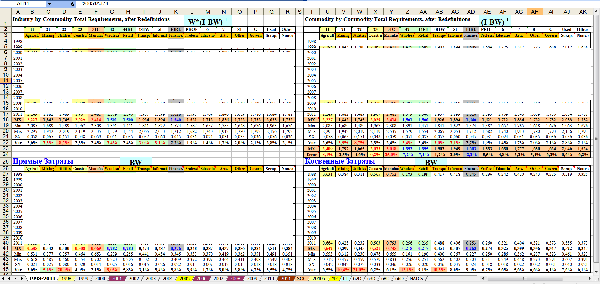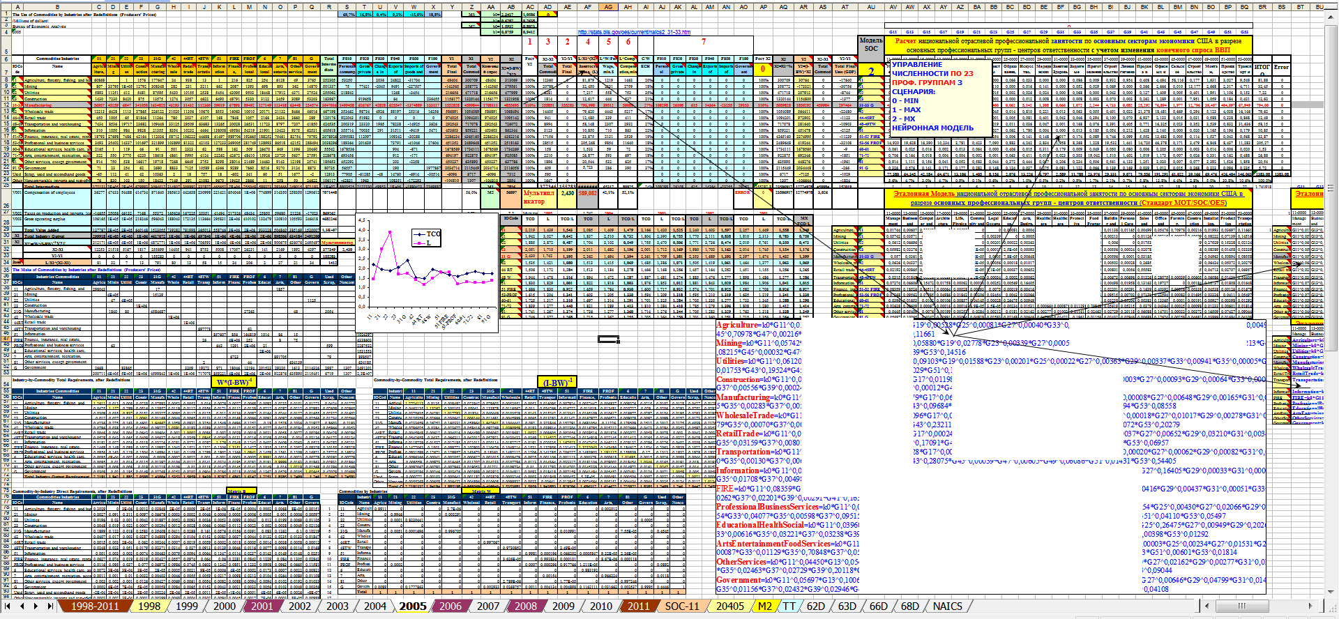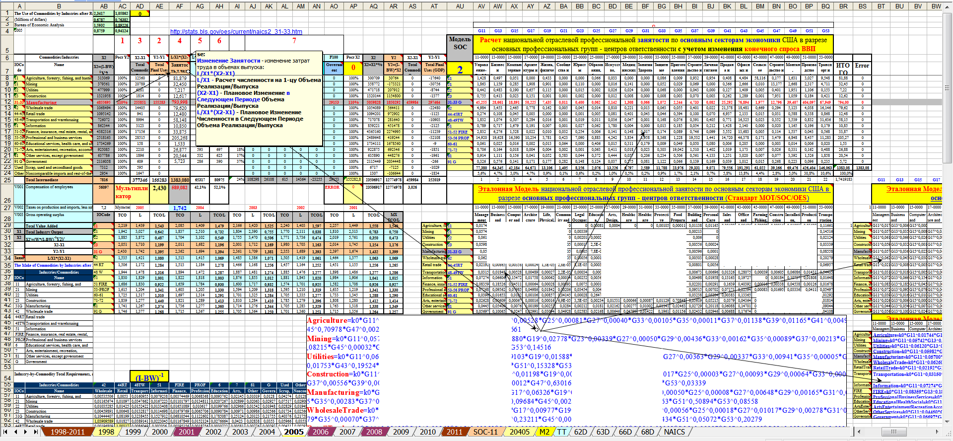 В рамках современной (действует с 1998г.), системы северо-американского промышленного стандарта США, Канады, Мексики (NAICS - North American Industry Classification System), расчет ведется для более 1000 отраслей экономики США.