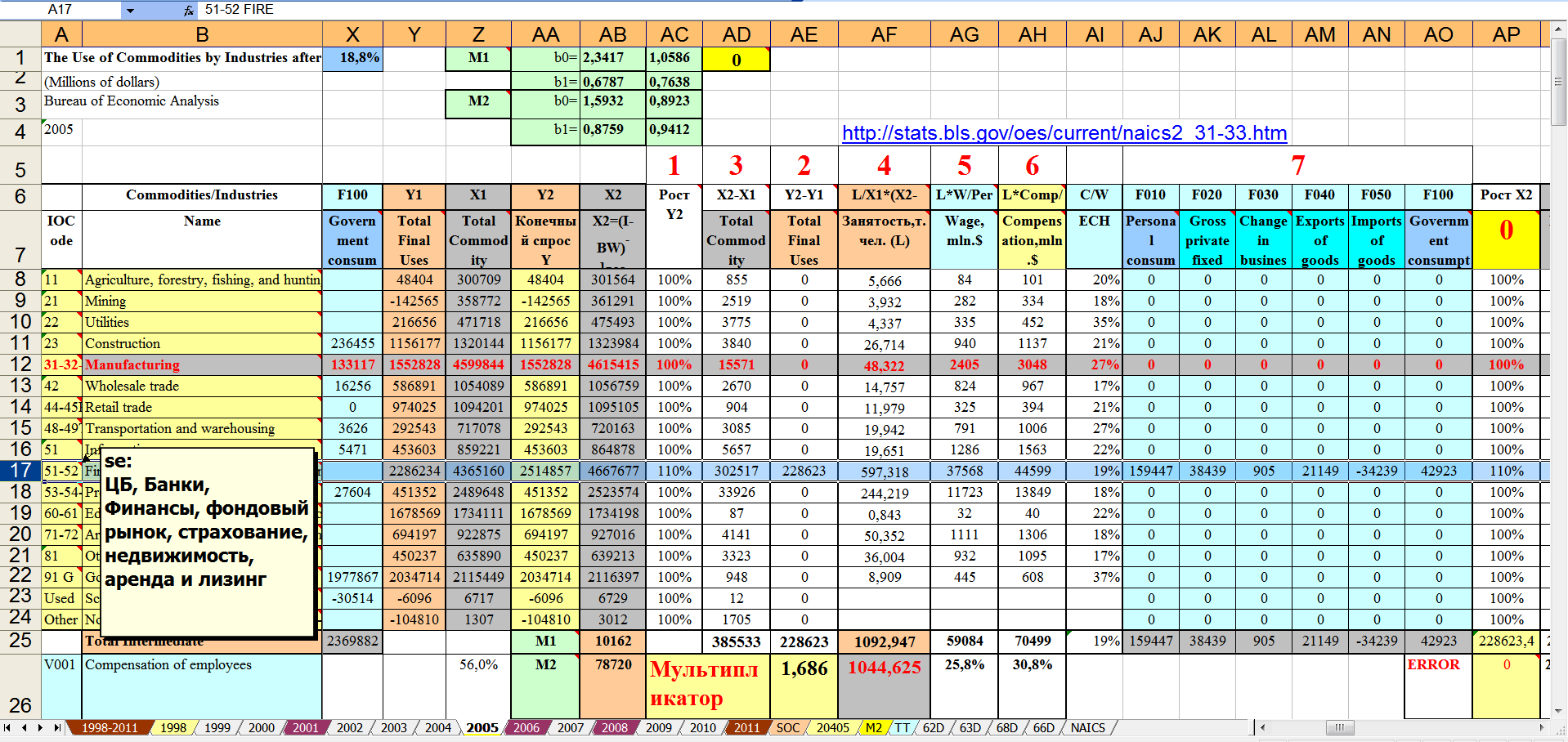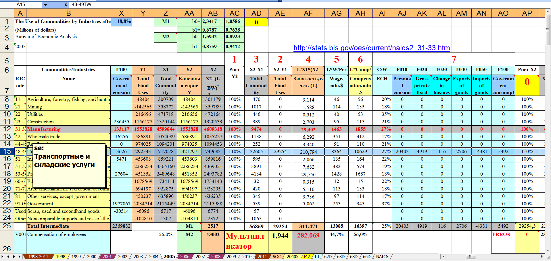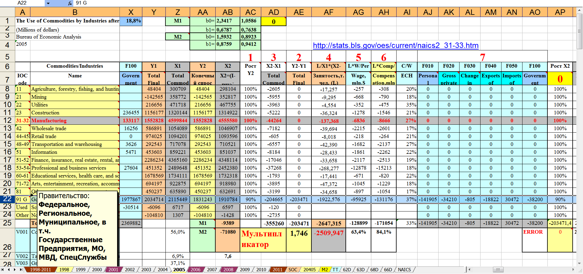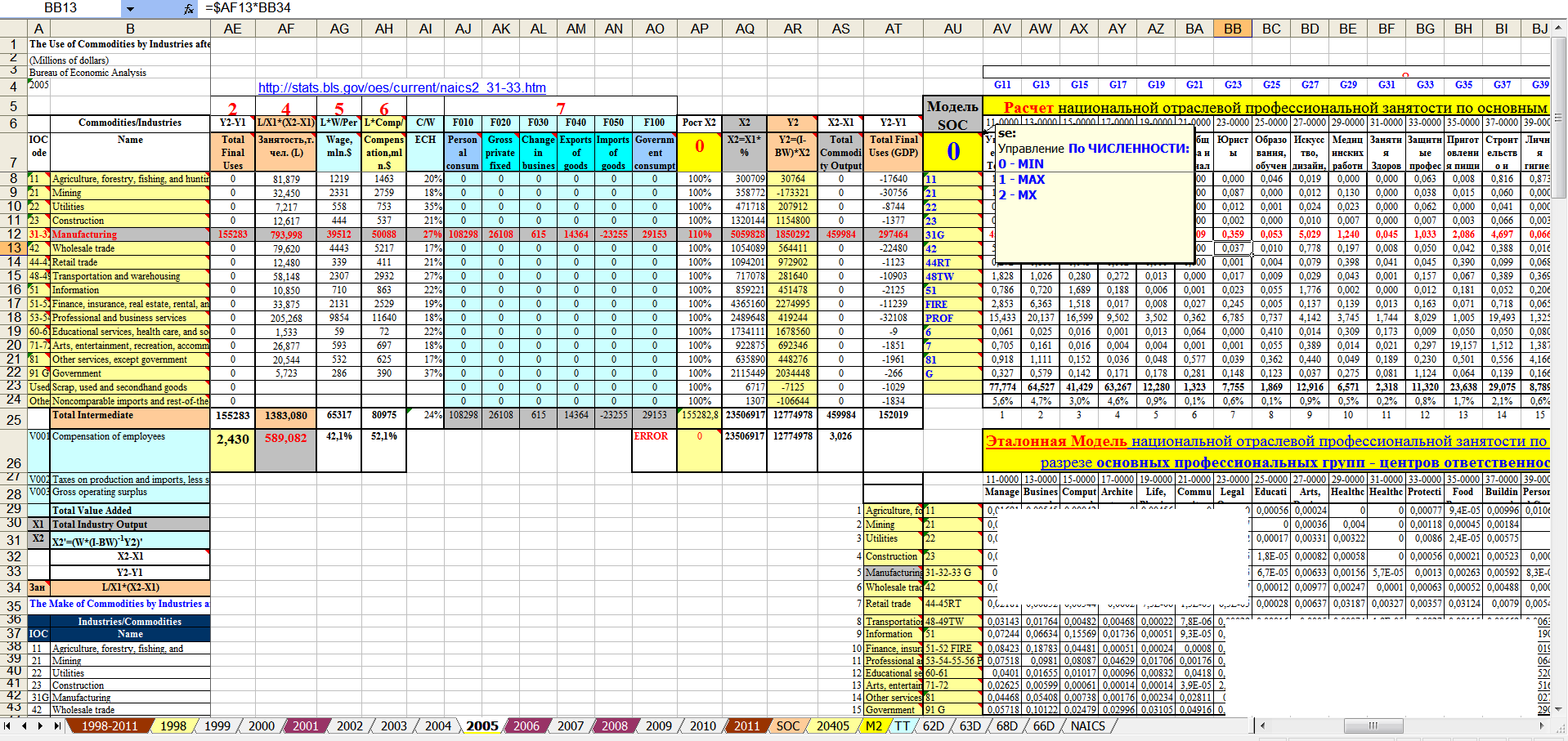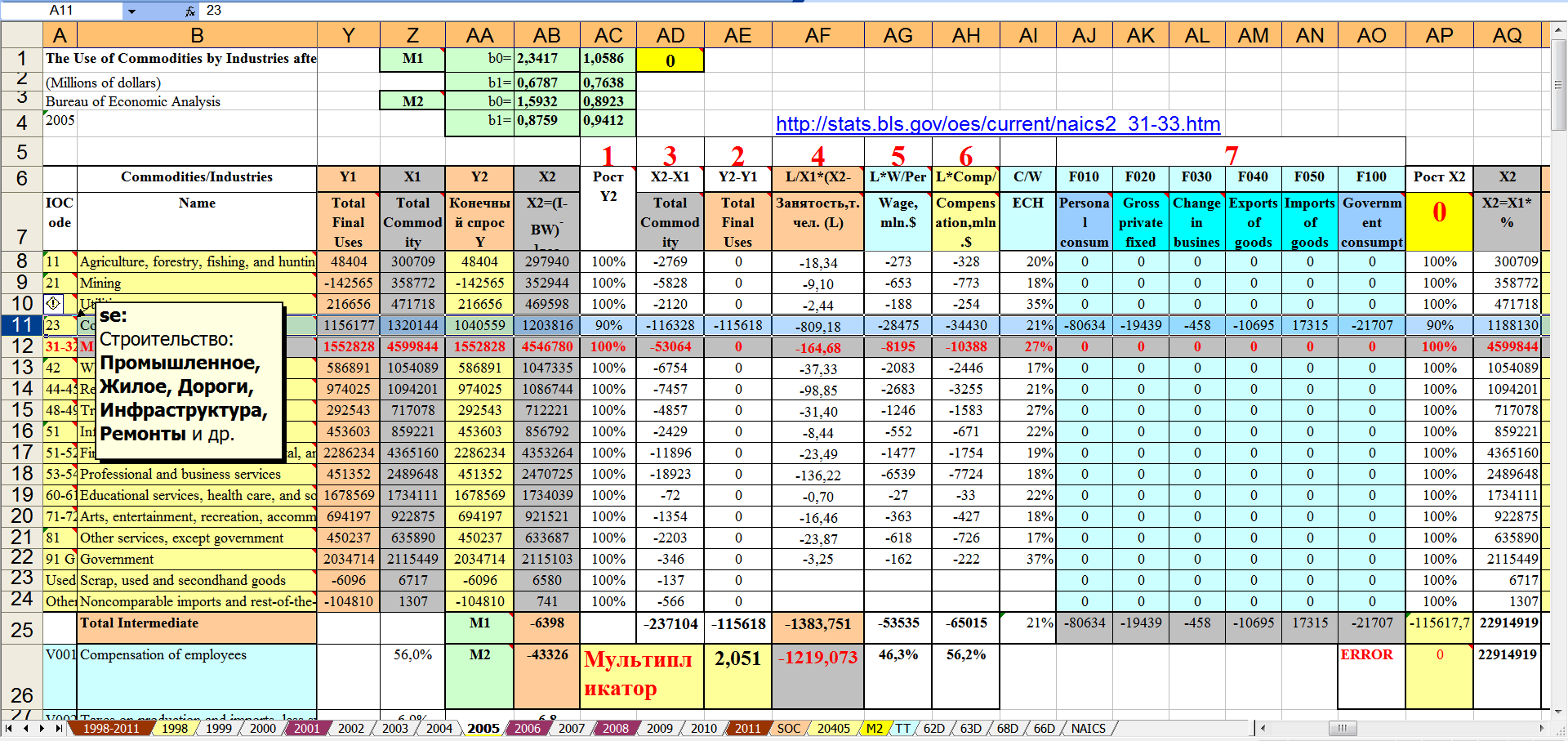 В рамках современной (действует с 1998г.), системы северо-американского промышленного стандарта США, Канады, Мексики (NAICS - North American Industry Classification System), расчет ведется для более 1000 отраслей экономики США.